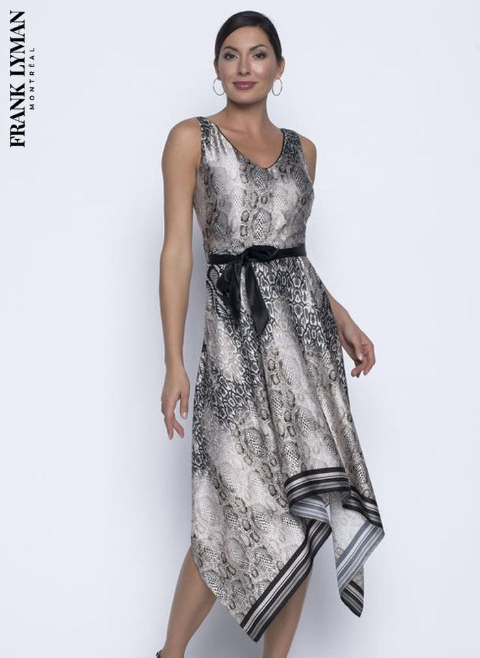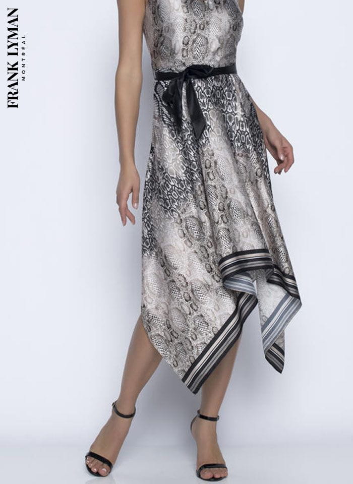 Frank Lyman, Oryginalna i niepowtarzalna sukienka satynowa z motywem wężowej skóry. Wyjątkowy fason, góra bez rękawów, spódnica rozkloszowana z czarnym pasem podkreślającym asymetrię. Kreacja ukazuje piękno oraz kobiece atuty. Idealna na uroczyste okazje, wyjścia wieczorowe i imprezy okolicznościowe.