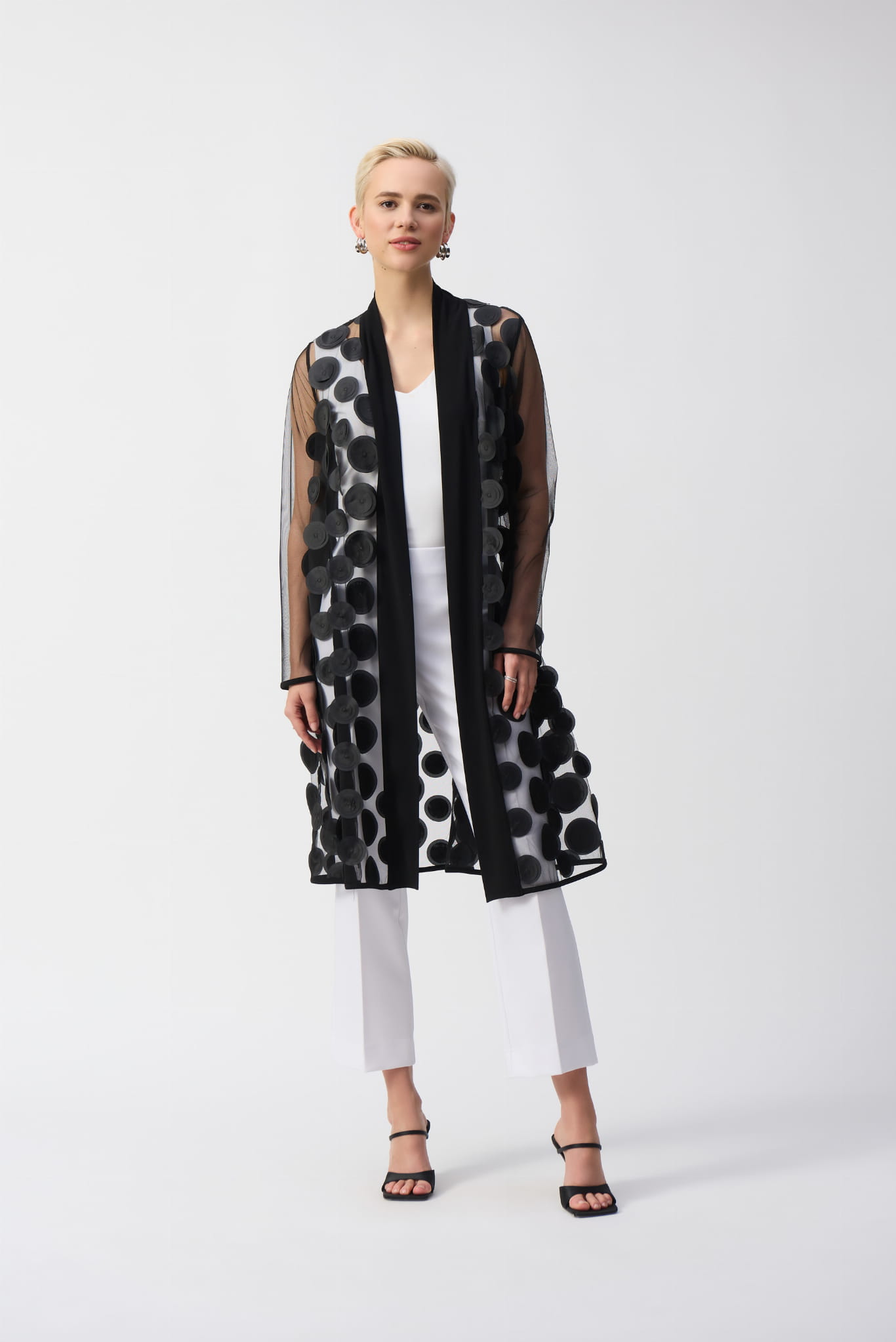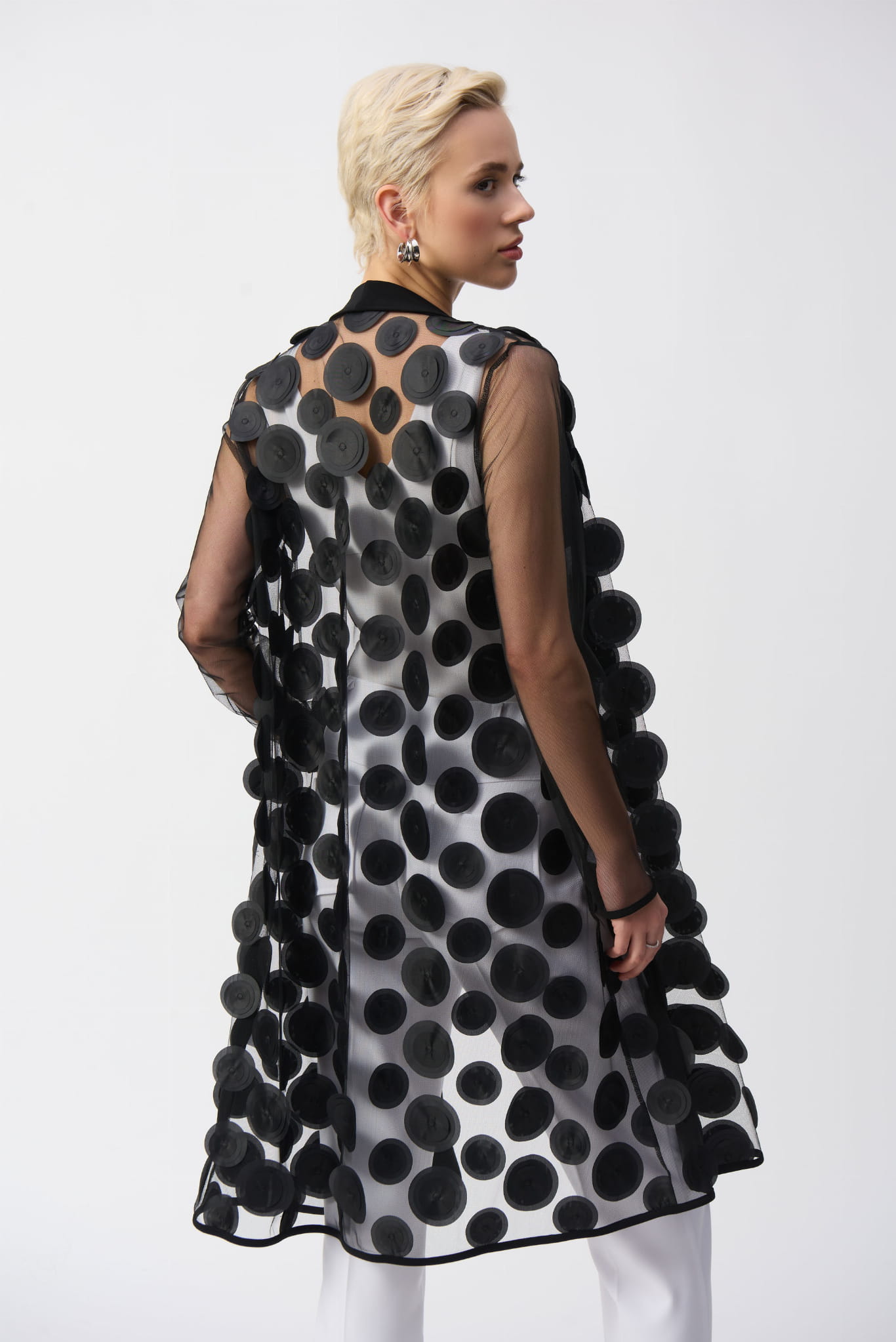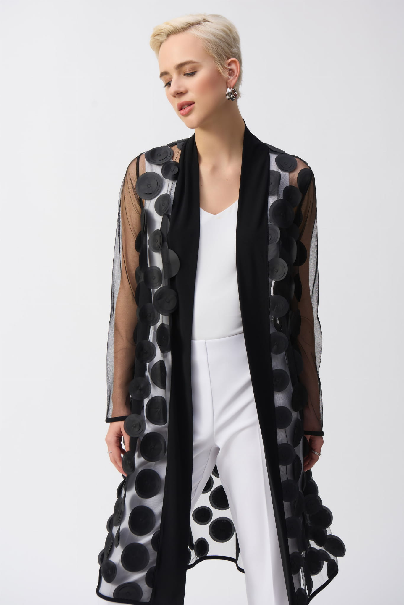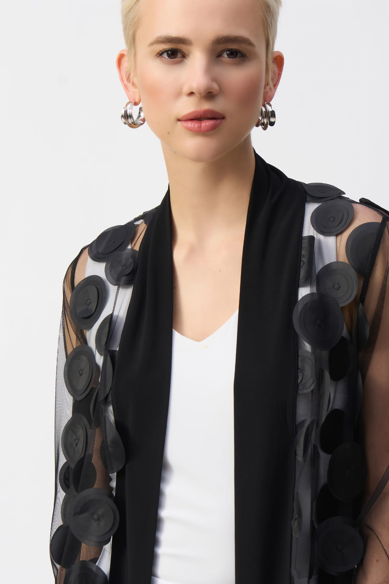 Joseph Ribkoff, Narzutka z dzianiny 3D w oryginalne, czarne koła. Tiul pokryty okrągłymi aplikacjami 3D, długi tiulowy rękaw. Wyjątkowy i niepowtarzalny element garderoby, idealny do stylizacji wizytowych,