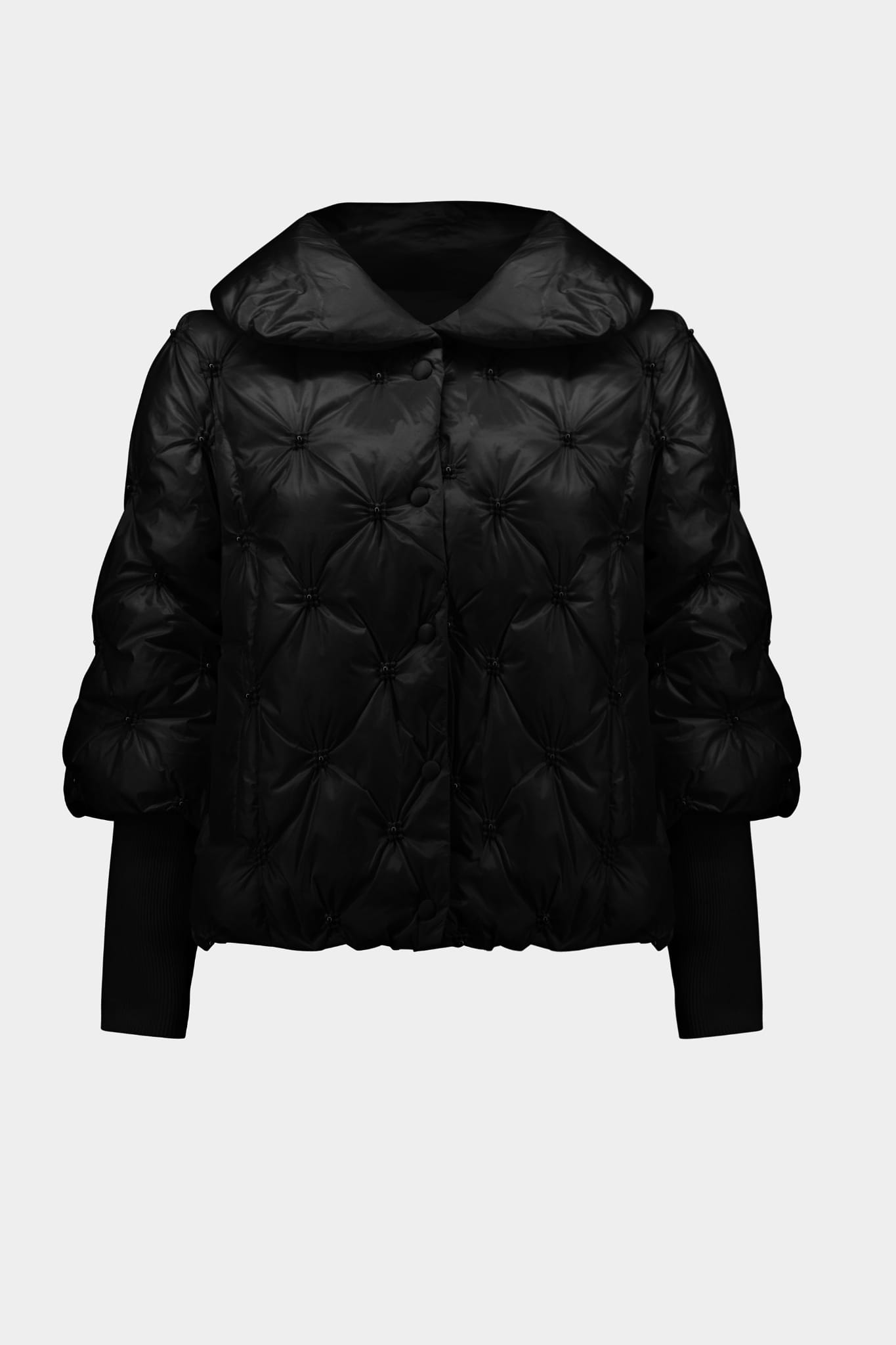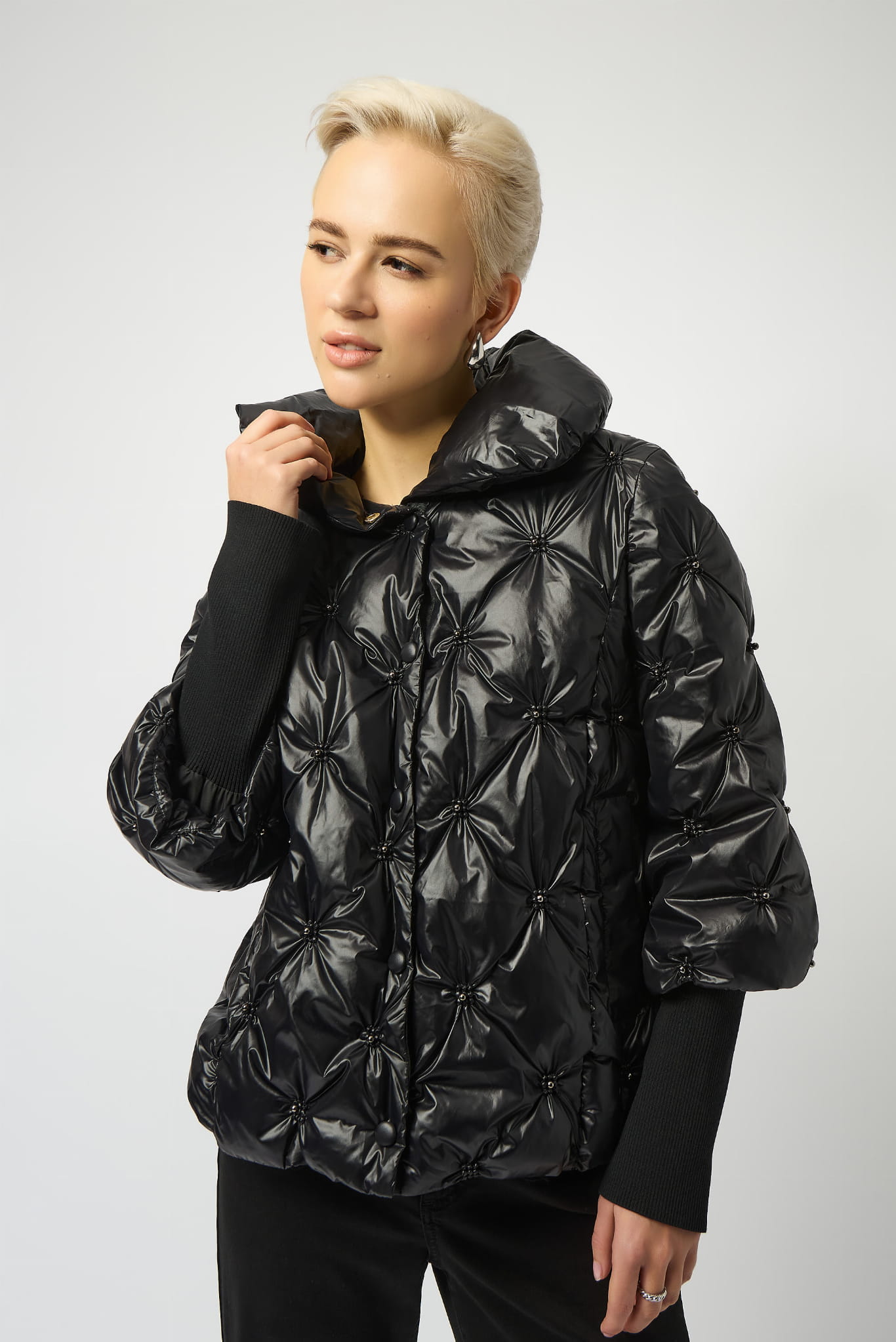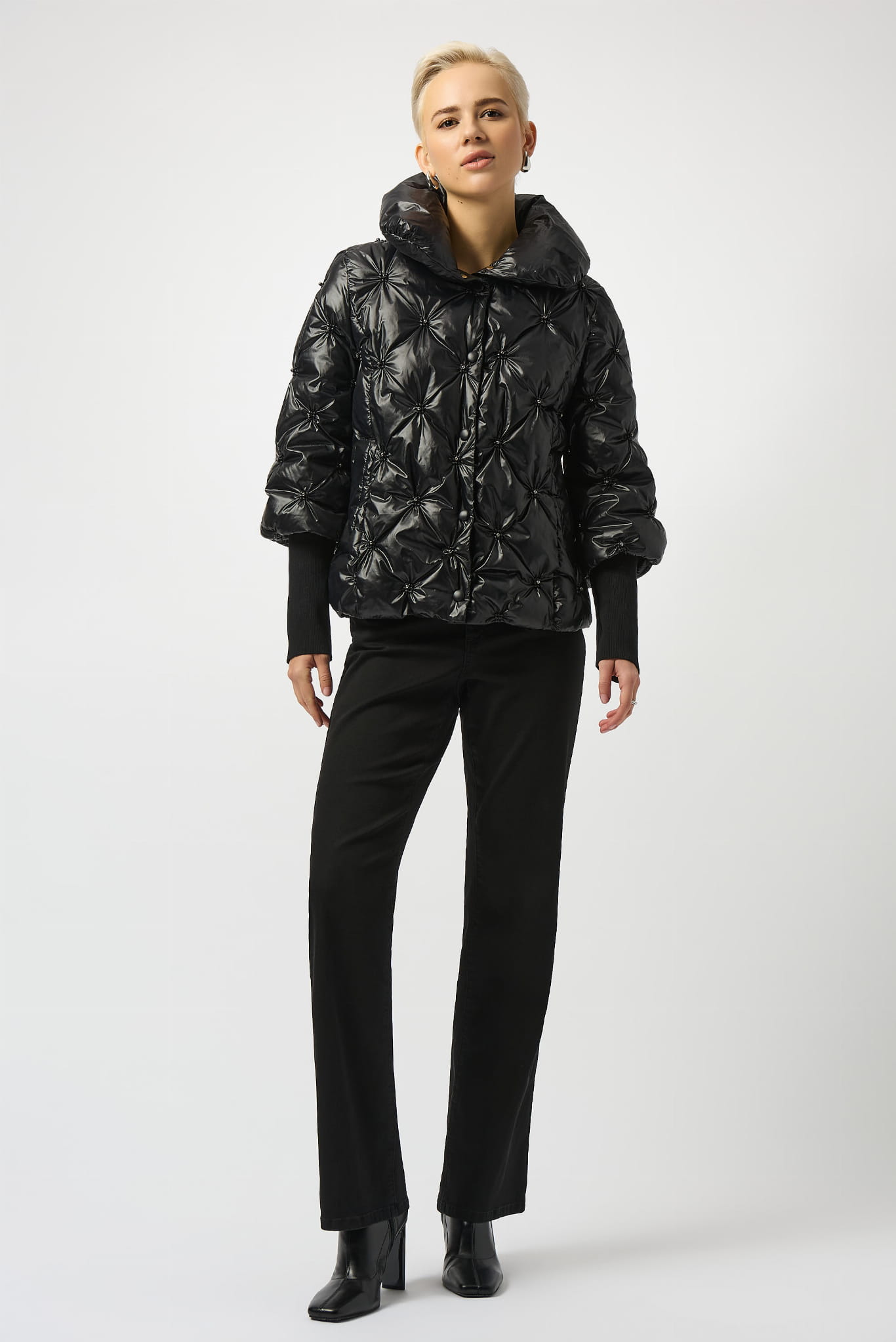 Joseph Ribkoff 253931 Efektowna, czarna kurtka pikowana z kołnierzem zdobiona oryginalnymi dżetami. Fason kurtki, zapinana na napy, szeroki rękaw 3/4 z przedłużanym, eleganckim ściągaczem. Lekki połysk, oryginalny krój i piękne misterne zdobienia na pikowaniu nadają jej wyjątkowy i niepowtarzalny charakter. Nada każdej stylizacji szyku i klasy z pazurem.