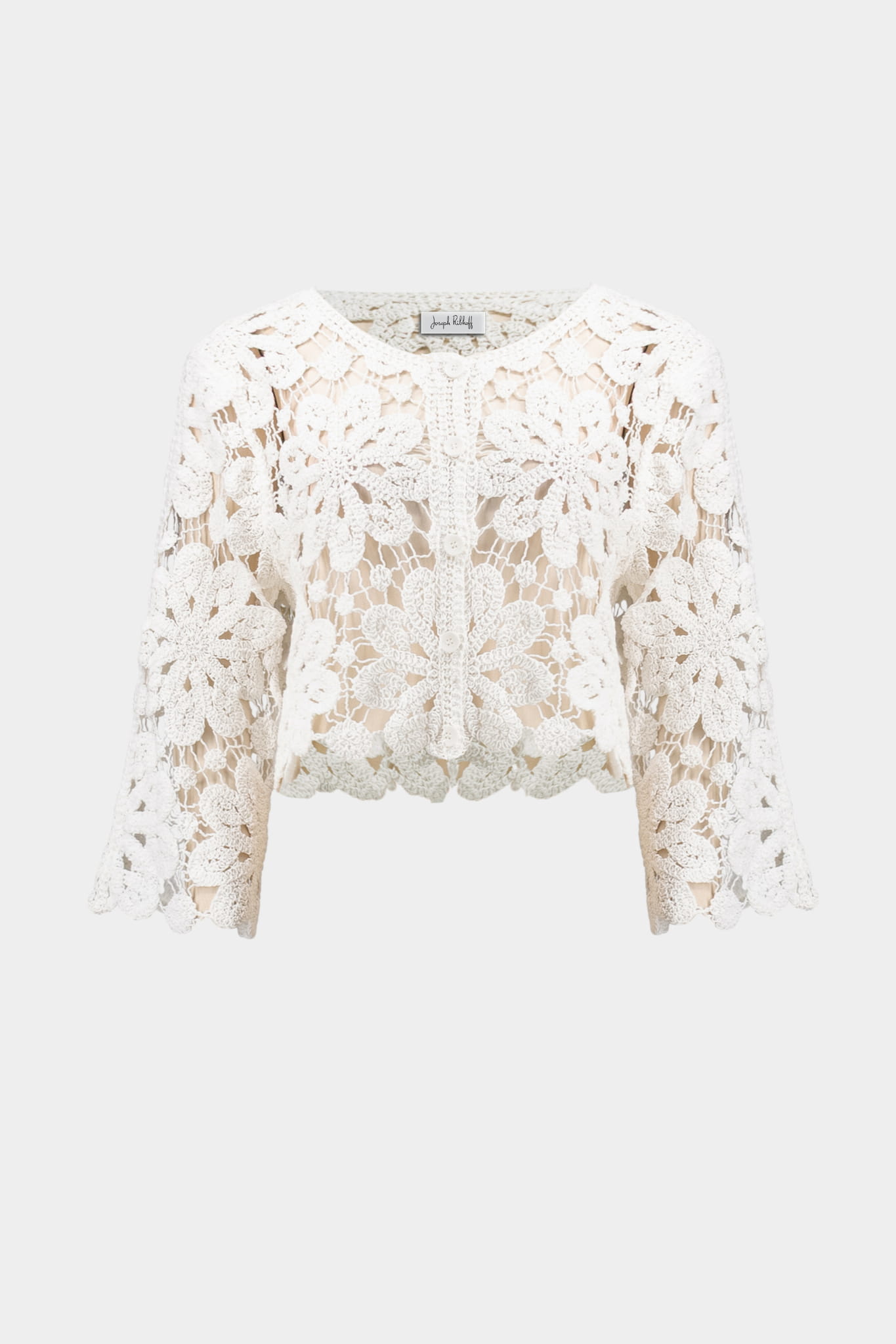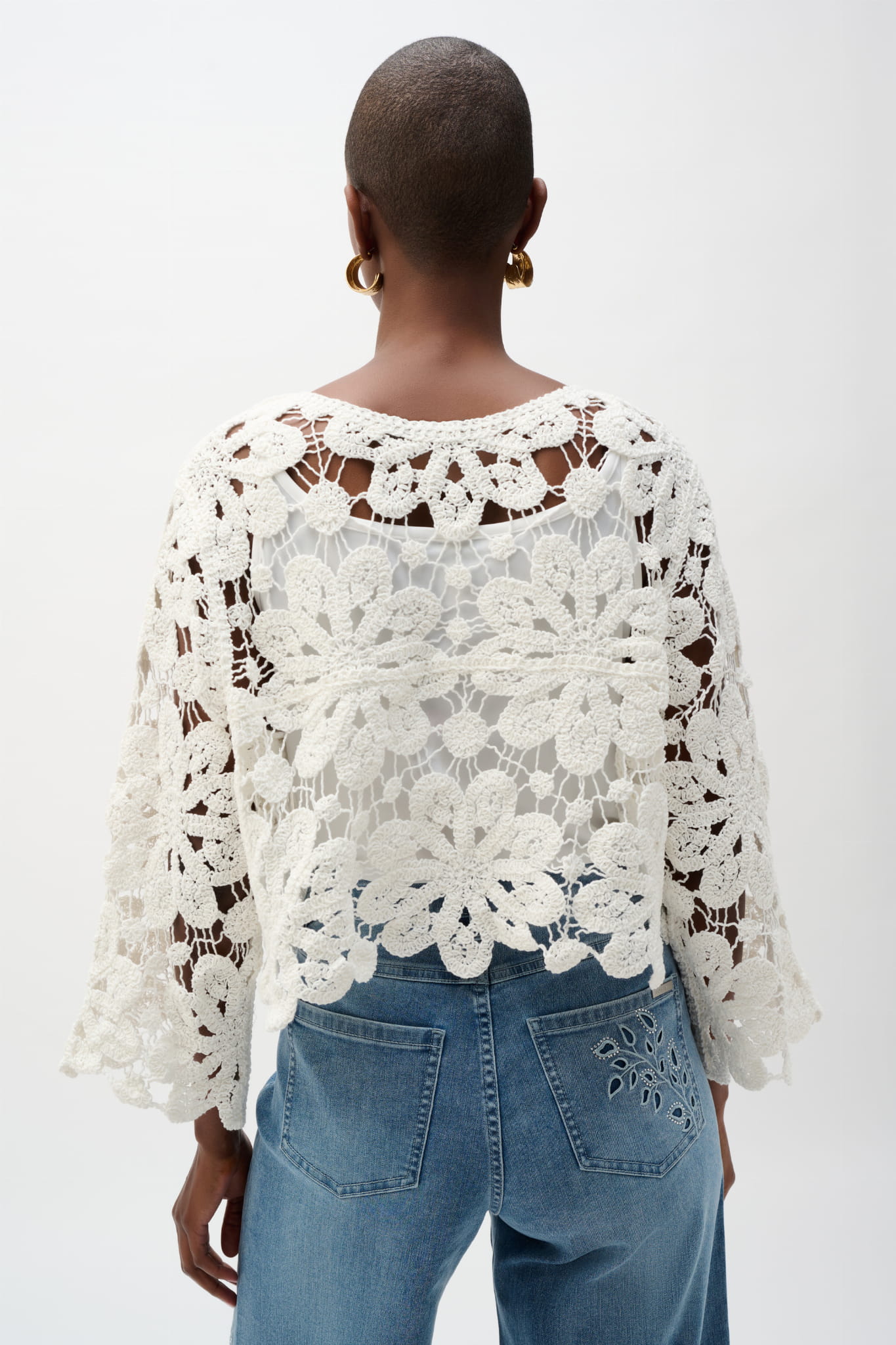 Joseph Ribkoff 262958 kremowy, koronkowy żakiet. Stylowy i niepowtarzalny, z rozkloszowanym rękawem długość 3/4. Wykonany w 100% z bawełny, model ażurowy w piękne duże kwiaty. Zapinany na eleganckie guziki. Pudełkowy, krótki krój sprawia, że żakiet idealnie pasuje zarówno do sukienki jak i do spodni. To nietuzinkowa rzecz, która idealni dopełni Twoją garderobę na nadchodzący sezon wiosenno-letni.