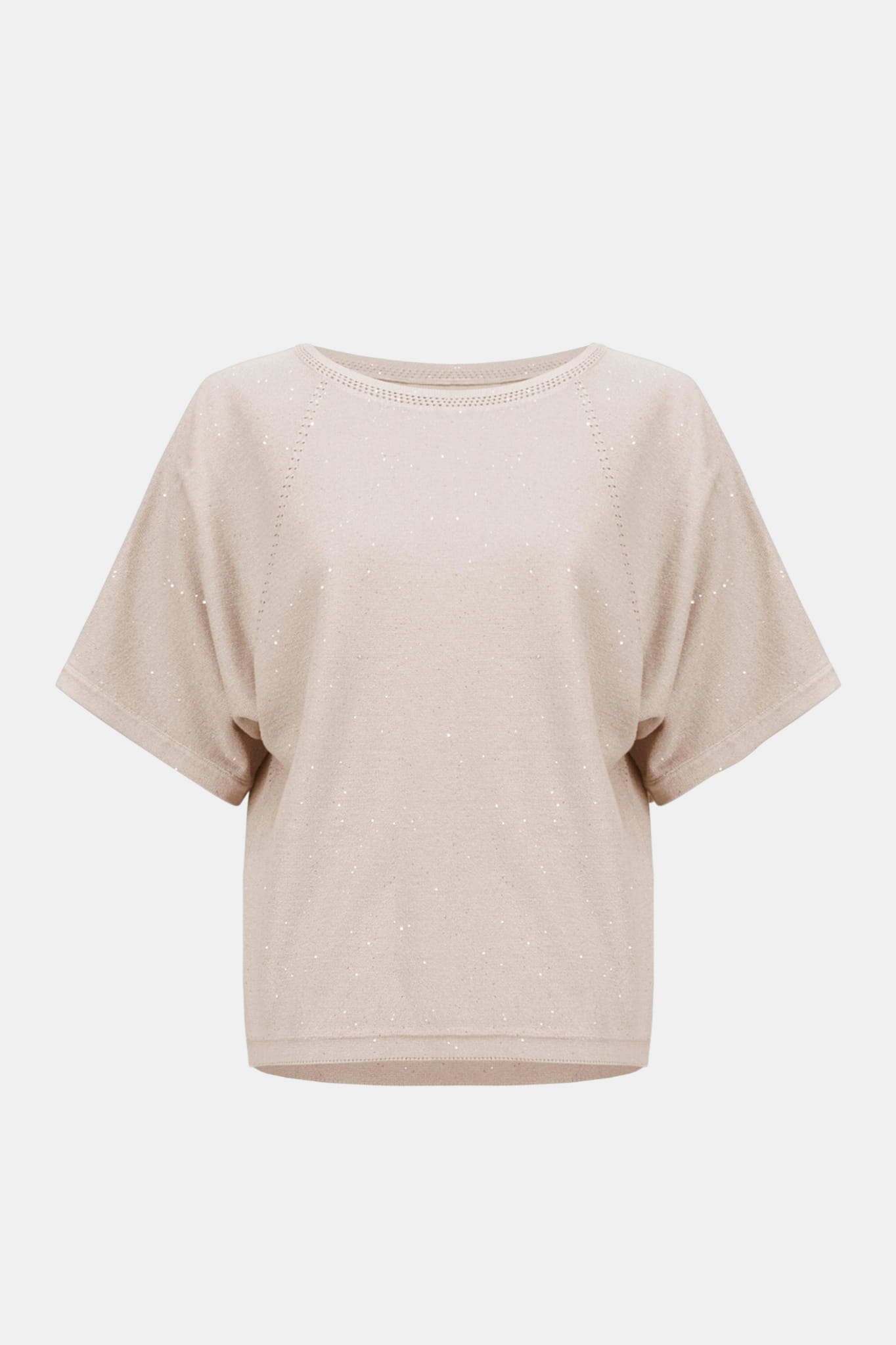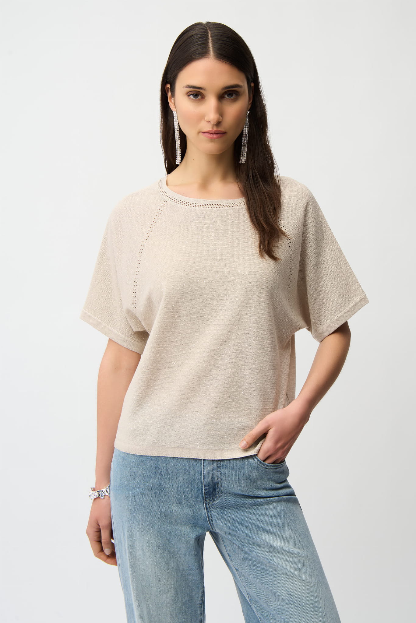 Joseph Ribkoff 261917 Beżowy, lekki sweter delikatnie zdobiony dżetami na całej powierzchni. Model o swobodnym kroju z krótkim rękawem i subtelnymi ażurowymi wycięciami .Świetna jakość, niewymuszona klasa i elegancja. Idealny na okres wiosenno - letni do stylizacji casuall'owych do pracy i wyjścia.