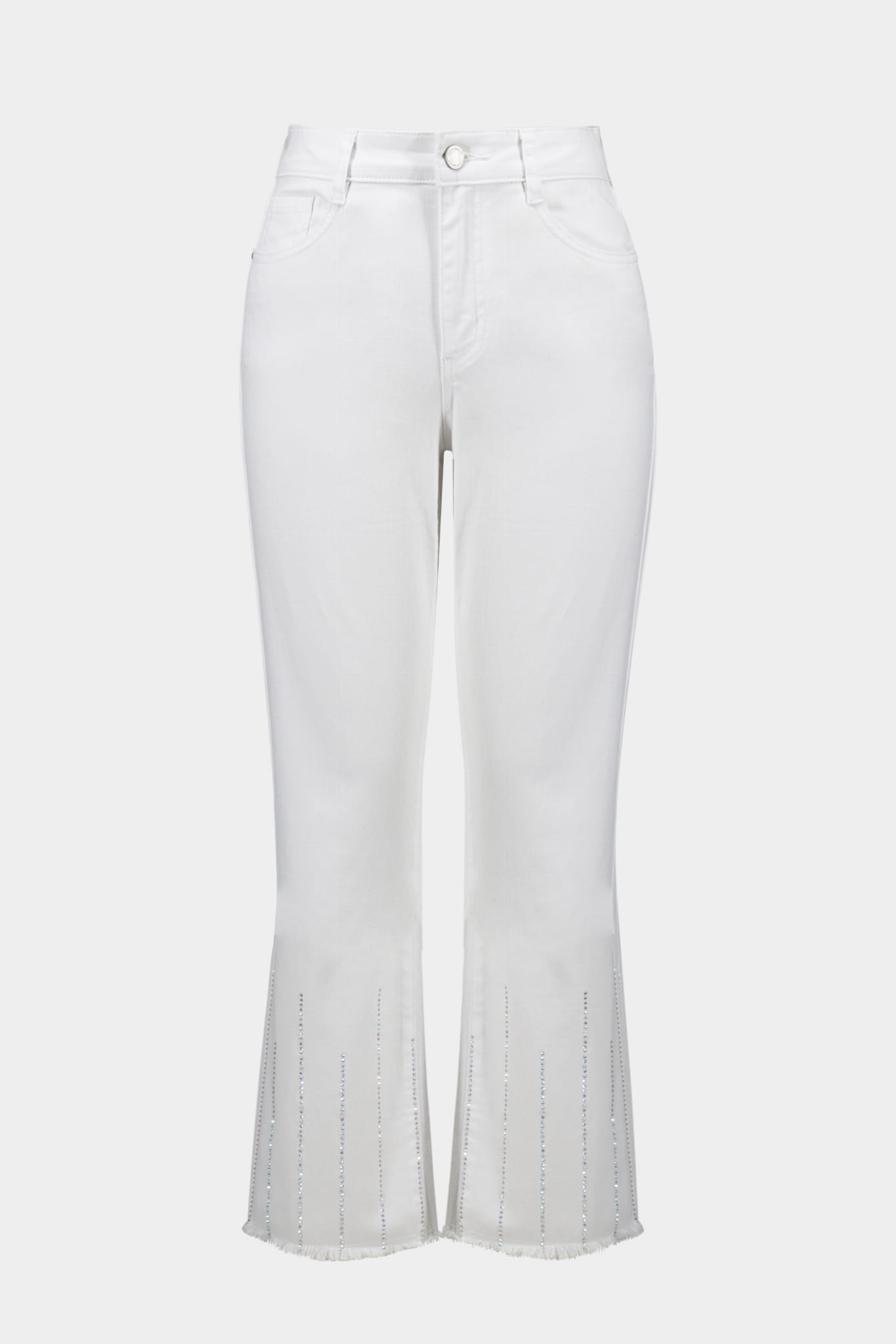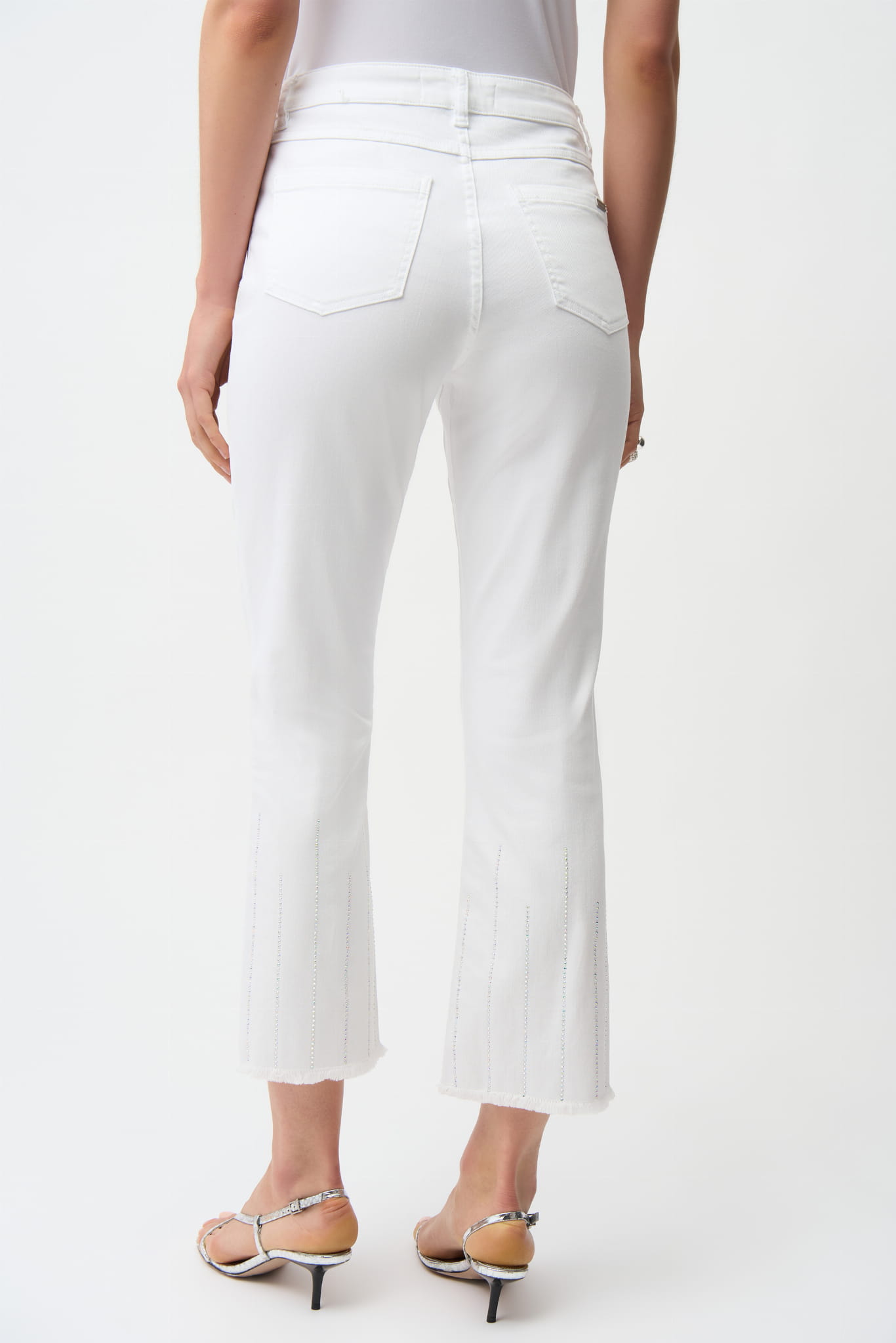 Joseph Ribkoff 261974 Białe spodnie o długości 3/4 z nogawką zdobioną drobnymi, srebrnymi dżetami. Wykonane z elastycznej i bardzo wygodnej tkaniny jeansowej o wysokiej zawartości bawełny i modalu. Bardzo komfortowe, nie krępują ruchów i fantastycznie dopasowują się do damskiej sylwetki w każdym rozmiarze. Nogawka finezyjnie postrzępiona na dole, Oryginalnie i przepięknie zdobiona nogawka pionowo drobnymi dżetami na całości, sprawia, że są one niezwykle oryginalne i efektowne. Z najnowszej kolekcji marki Joseph Ribkoff, idealne na wiosnę i lato. Do kompletu proponujemy katanę kod produktu 261973.