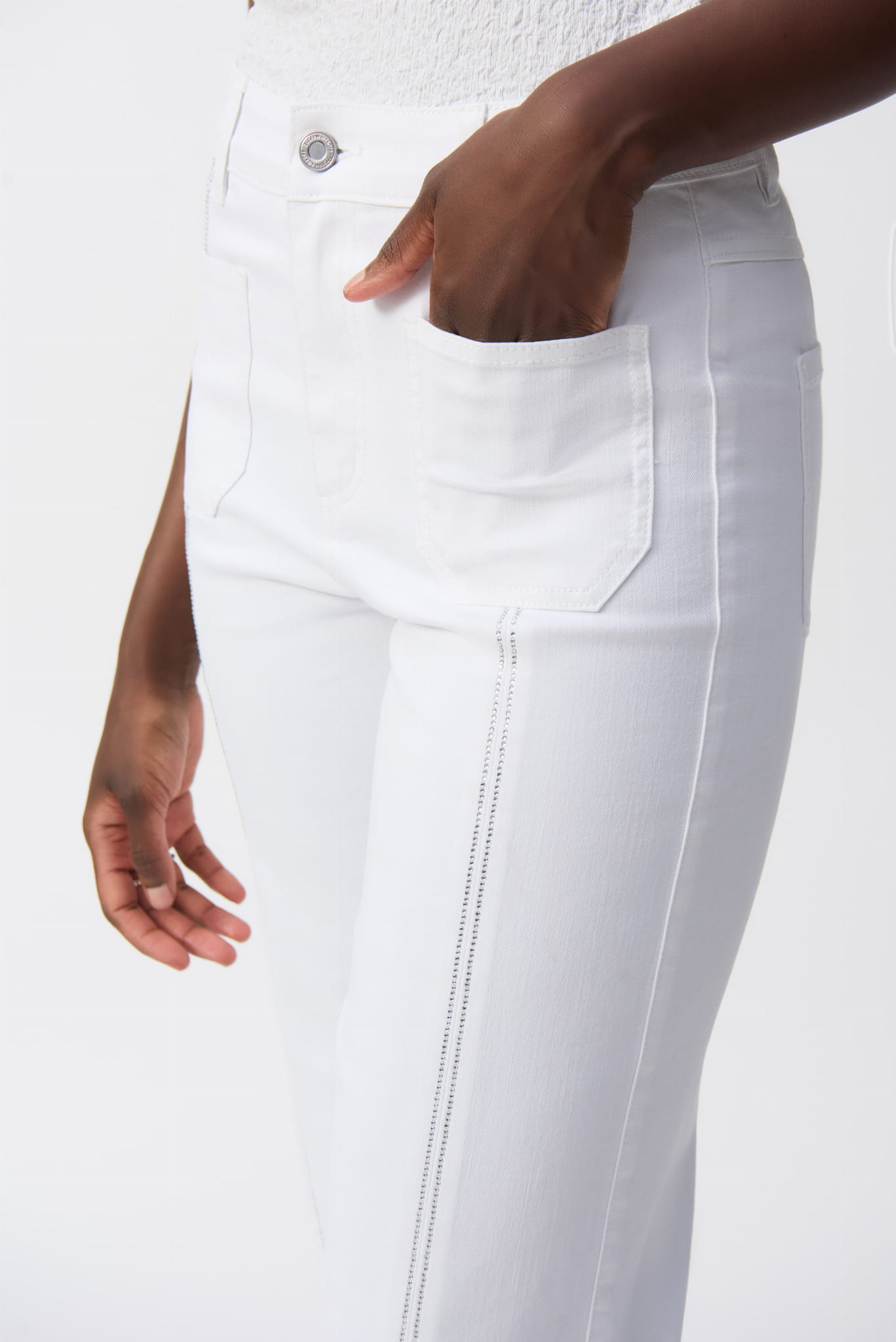 Joseph Ribkoff 251901 Białe spodnie o luźnym fasonie z pękniętą nogawka wykończone eleganckim strzępieniem i przepięknie zdobione drobnymi dżetami. Wysoki stan idealnie dopasowuje się do damskiej sylwetki i pięknie ją podkreśla w każdym rozmiarze. Posiada kieszenie z przodu. Delikatne zdobienie mieniącymi się dżetami podkreśla oryginalność modelu. Spodnie występują w 5 kolorach, jeśli potrzebujesz inny kolor wyszukaj w sekcji "SZUKAJ" po kodzie produktu: biały 251901-12, beżowy 251901-3854, jasny brąz 251901-4266, khaki 251-901-3380 oraz jasny róż 251901-4475