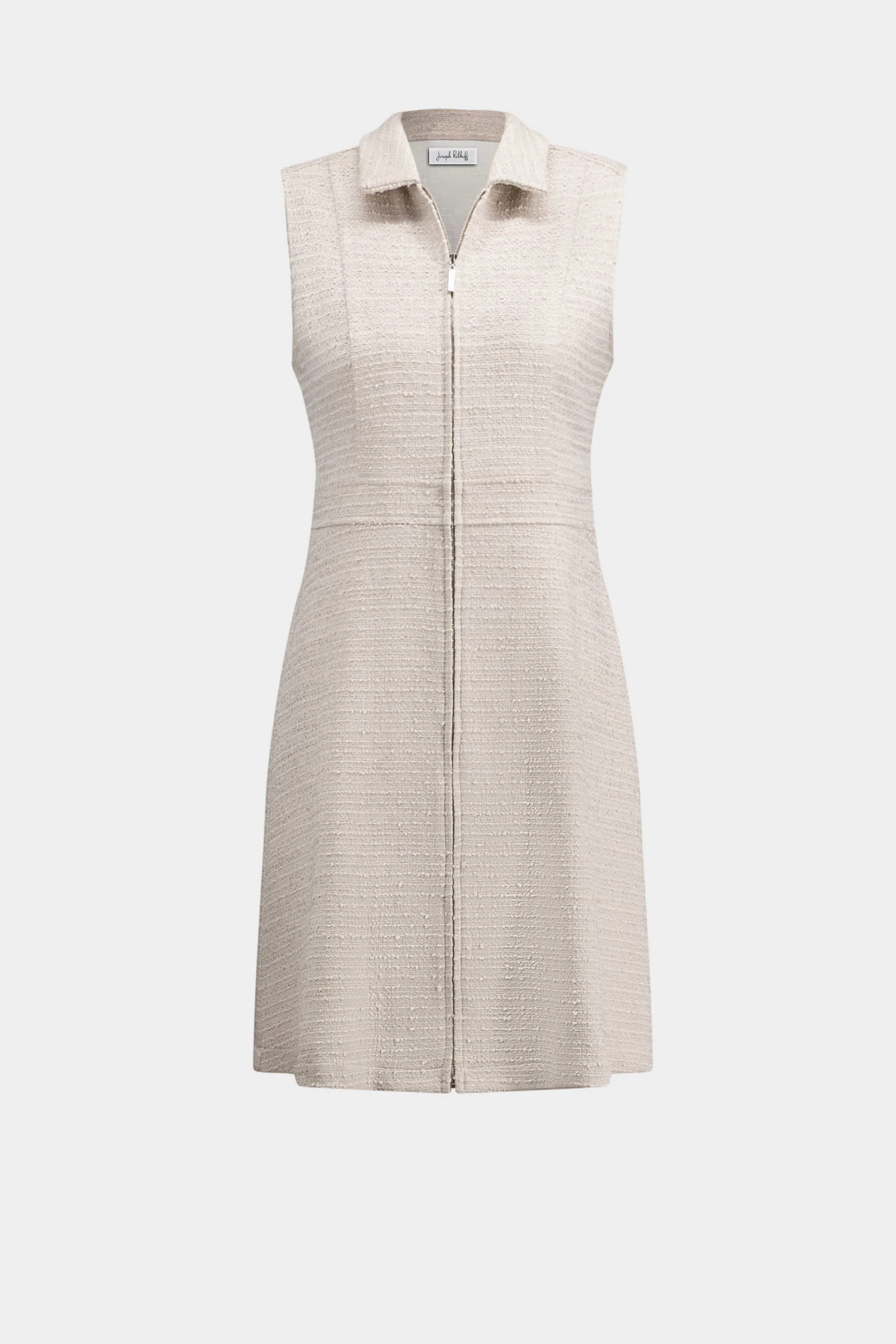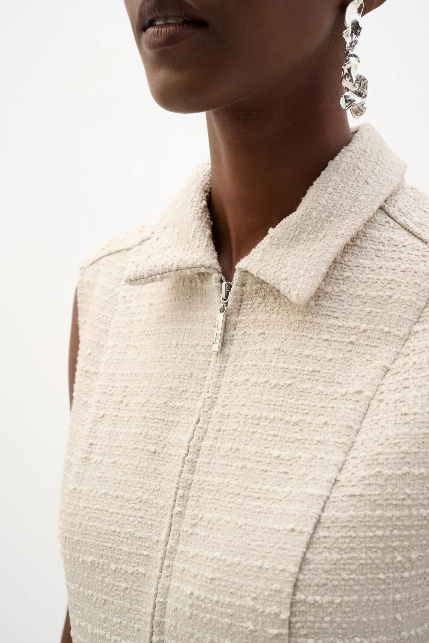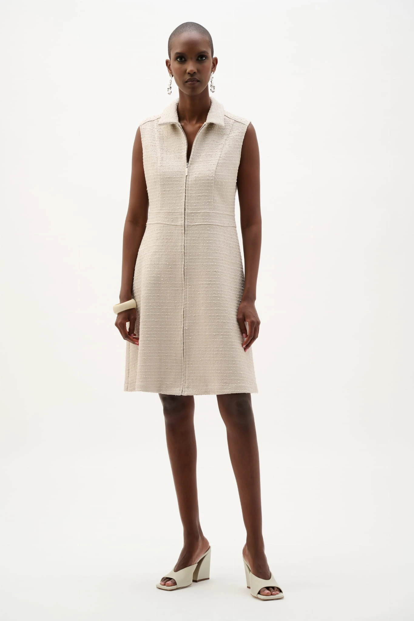 Joseph Ribkoff 262221 Jasno beżowa sukienka bez rękawów zapinana na zamek, z kołnierzem. Długość do kolana, prosty krój lekko rozszerzany do dołu. Oryginalna tkanina nie krępuje ruchów, idealnie dopasowuje się do sylwetki, nadaje klasy i elegancji. Idealna jako kreacja wizytowa lub na wiosnę i lato.