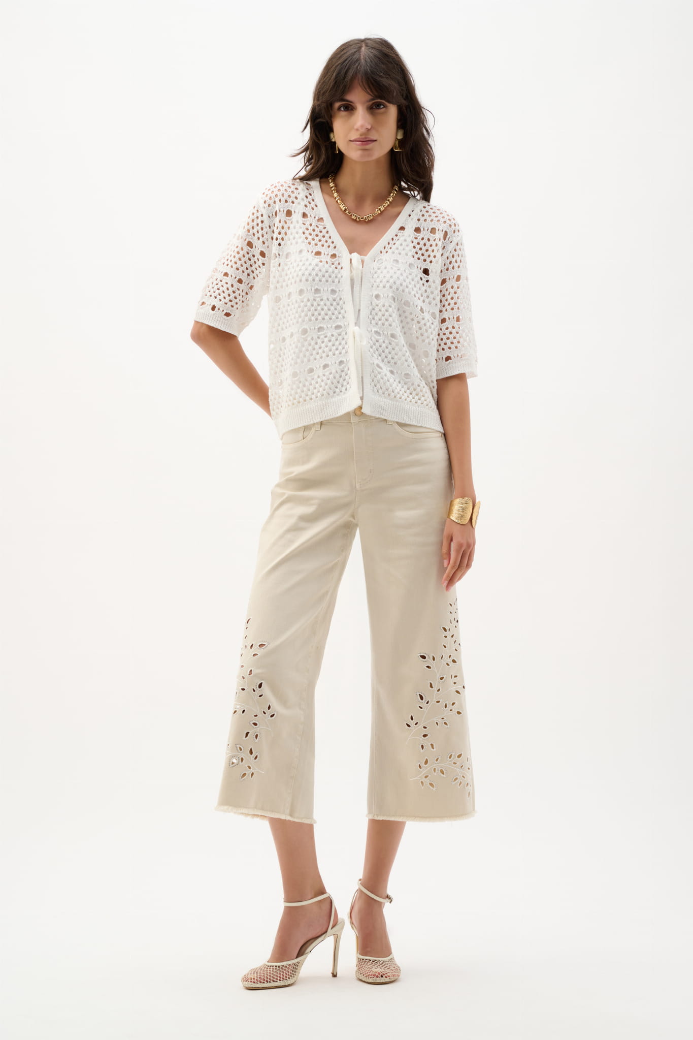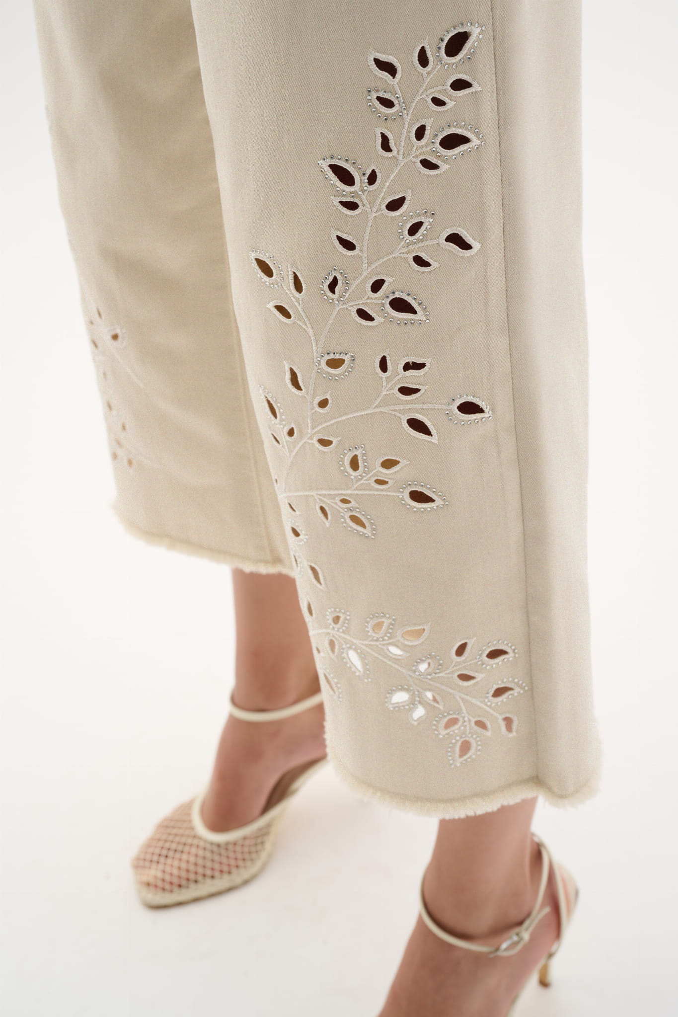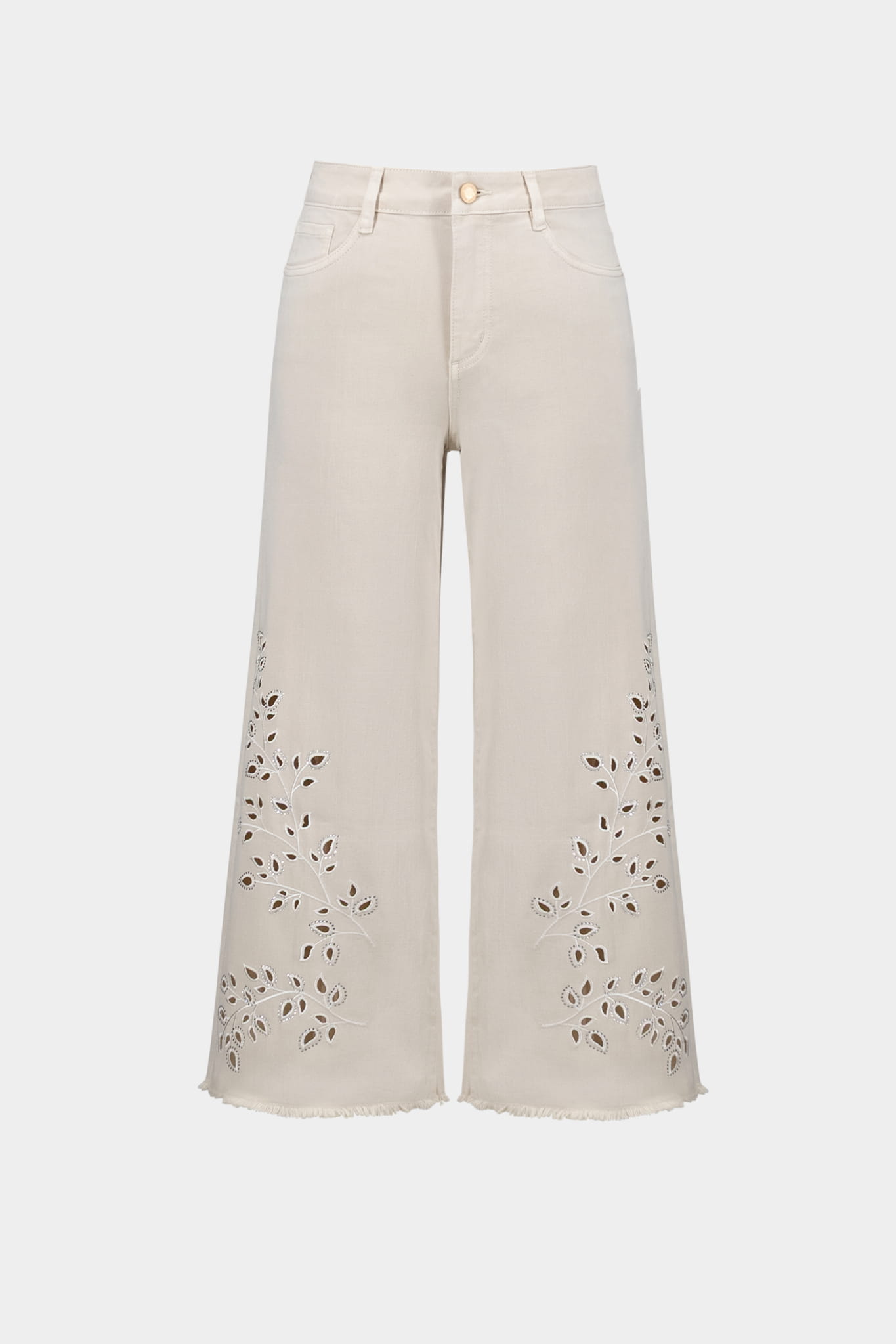 Joseph Ribkoff 262935 kuloty w kolorze kremowym (jasno beżowym) subtelnie zdobione haftem i dżetami. Szeroka nogawka i wysoki stan sprawiają, że pięknie podkreślają damską sylwetkę. Oryginalny haft na nogawkach i kieszeniach, subtelnie zdobiony delikatnymi dżetami nadaje im niepowtarzalny charakter. Te spodnie to perfekcyjny balans między elegancją, kobiecością a nowoczesnym stylem Idealne na wiosnę i lato, jeśli chcesz wyglądać stylowo, a jednocześnie czuć się swobodnie i komfortowo.