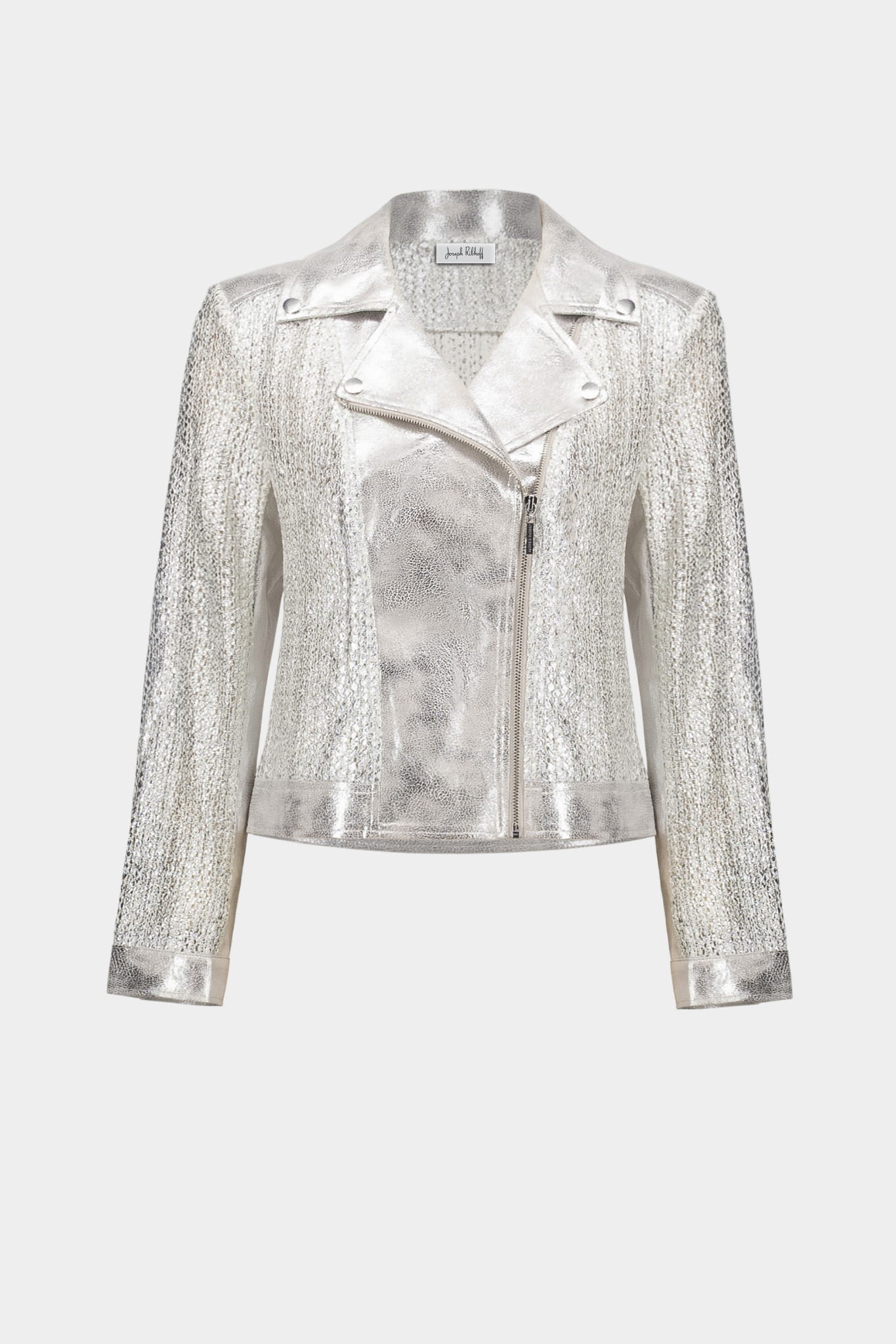 Joseph Ribkoff 262902 Ramoneska w kolorze champana ze srebrnym połyskiem. Niesamowicie oryginalna i stylowa. Wykonana z elastycznej, wygodnej, pracującej i przewiewnej tkaniny. Kołnierz w postaci klap zdobionymi eleganckimi guzikami. Zapinana na zamek. Efektowne zestawienie tkanin, skóry ekologicznej z dzianinowym splotem po bokach i na rękawach, nadaje jej niepowtarzalny charakter. Idealna jako stylizacja wizytowa, zakochasz się w niej od pierwszego założenia.