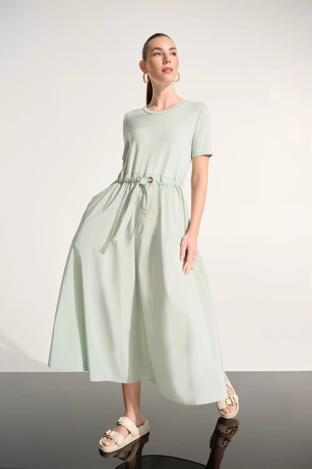 Joseph Ribkoff 262627-4526 Wyjątkowa, sportowa sukienka w kolorze jasnej pistacji. Kolor bardzo twarzowy doda Ci świeżości. Świetny fason sukienki, góra z małym dekoltem i krótkim rękawem, wiązana w pasie, rozkloszowana do dołu. Długość do łydki. Elastyczna tkanina nie krępuje ruchów, idealnie dopasowuje się do sylwetki i zapewnia komfort i wygodę. Idealna na wiosnę i lato.