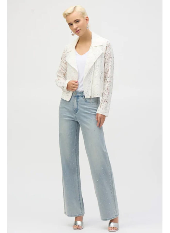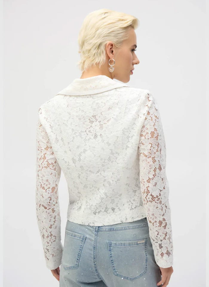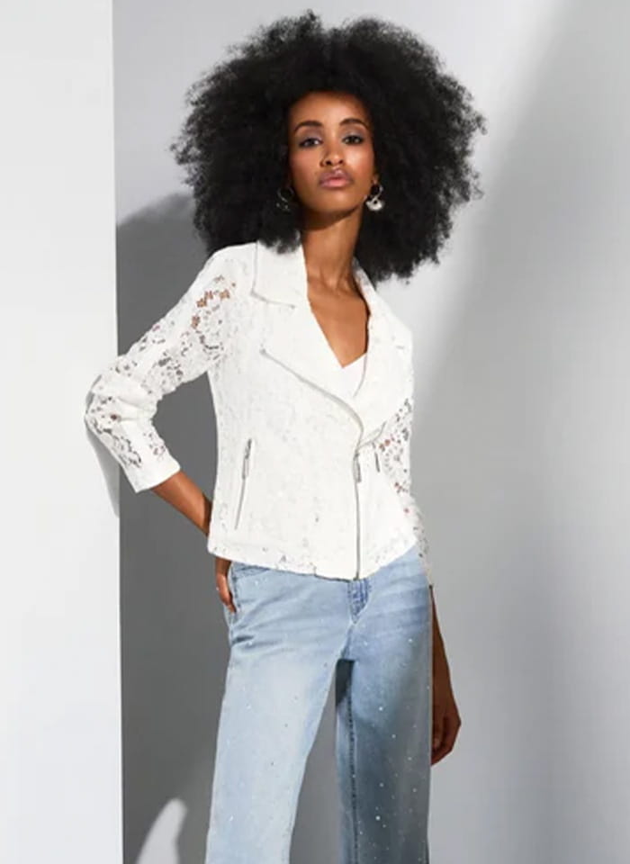 Joseph Ribkoff biały koronkowy żakiet typu ramoneska 252920 zapinany na zamek. Krój dopasowany, elastyczny i komfortowy. Idealny do stylizacji letnich oraz jako element stylizacji wizytowej.