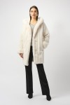Joseph Ribkoff 253926 Biały, dwustronny płaszcz z kapturem zapinany na guziki. Na jednej stronie piękne, sztuczne futerko w pionowe przeszycia, na drugiej błyszcząca tkanina foliowa.