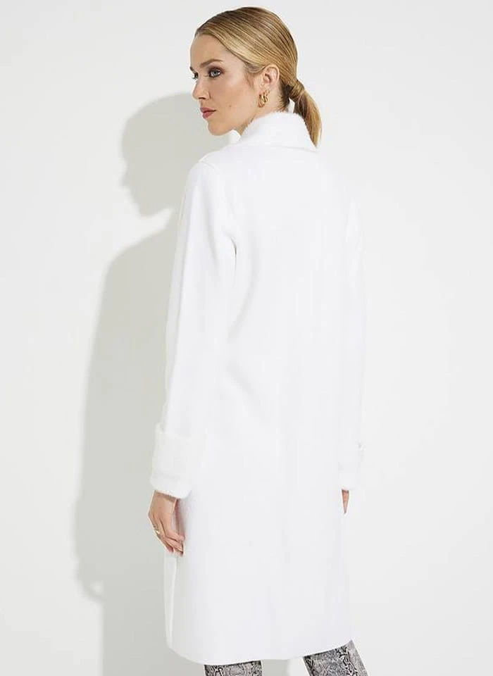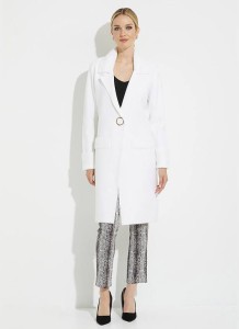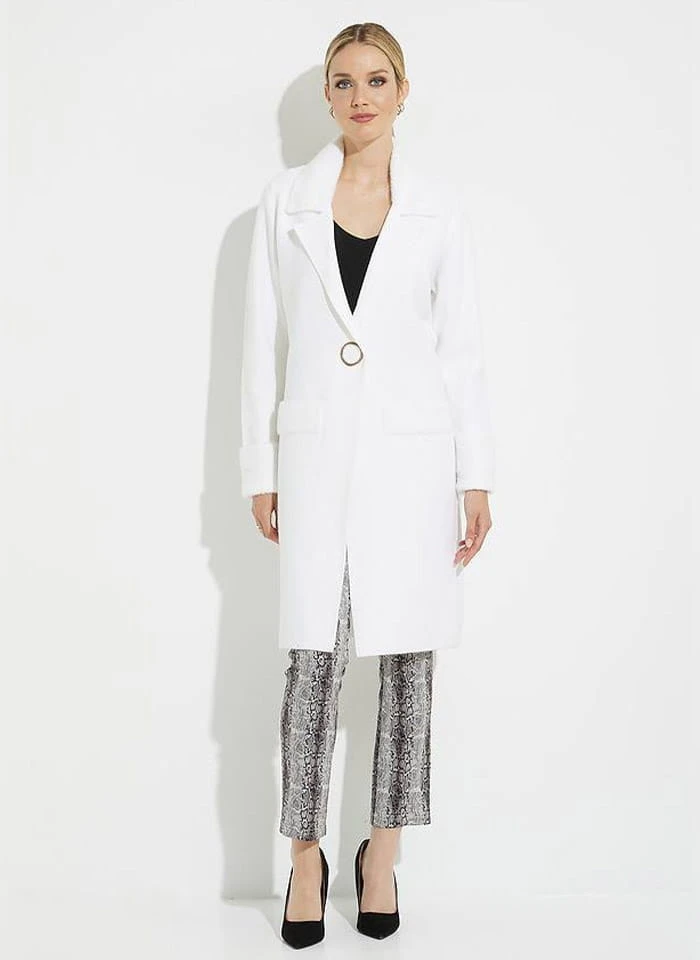 Joseph Ribkoff 223958 Długi, biały dzianinowy płaszcz zapinany na złoty guzik. Miły w dotyku, ciepły i niesamowicie efektowny.