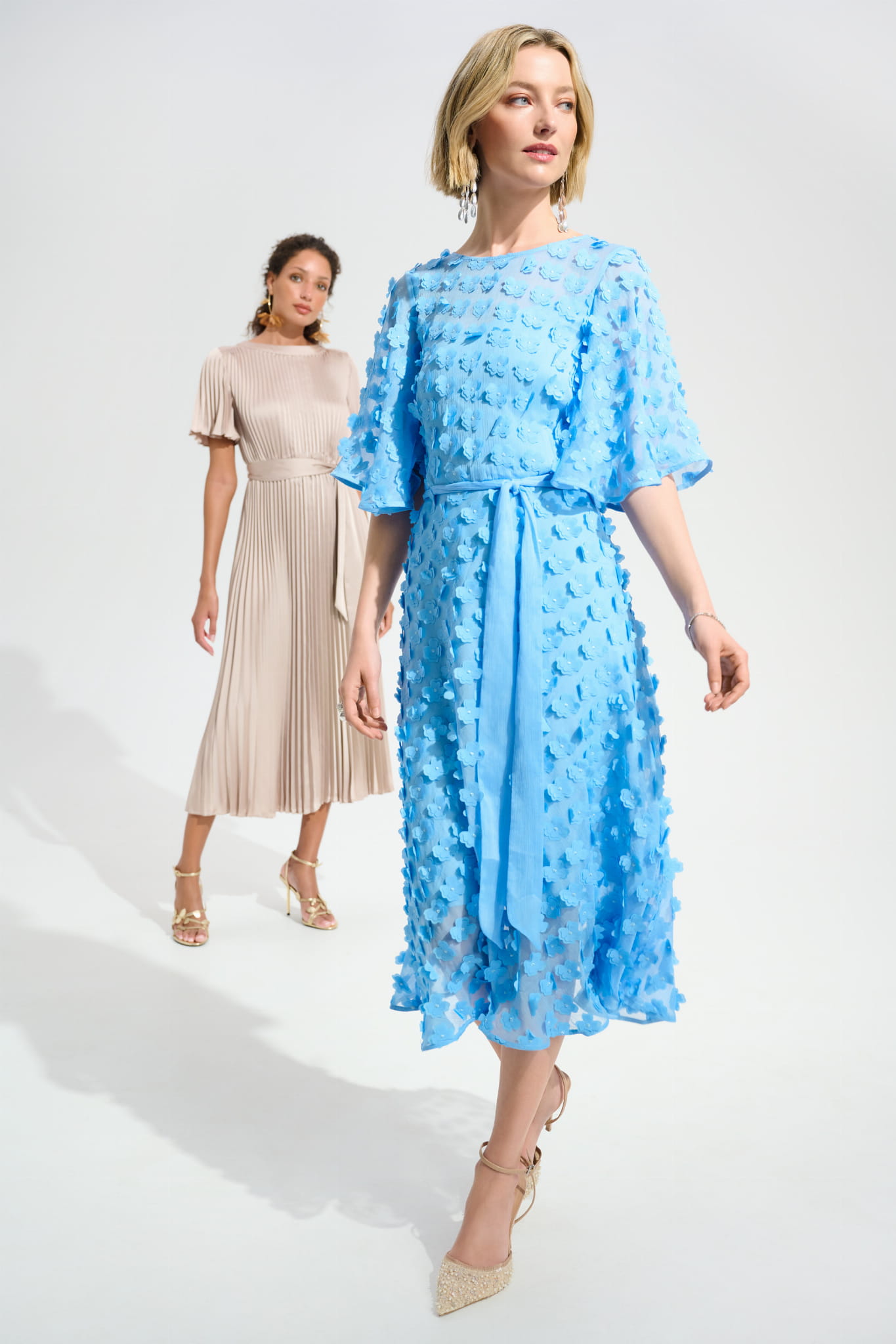 Joseph Ribkoff 261738 Błękitna, elegancka sukienka midi z najnowszej kolekcji zachwyca subtelną fakturą i efektownym, trójwymiarowym zdobieniem w postaci delikatnych kwiatowych aplikacji. Wykonana z lekkiej, półtransparentnej tkaniny pięknie układa się w ruchu, nadając stylizacji zwiewności i szyku. Luźniejsze rękawy o długości do łokcia oraz klasyczny, prosty dekolt zapewniają komfort i ponadczasową elegancję, a wiązany pasek w talii pozwala podkreślić sylwetkę i dopasować fason do figury. Długość midi oraz rozkloszowany dół tworzą harmonijną, kobiecą linię.