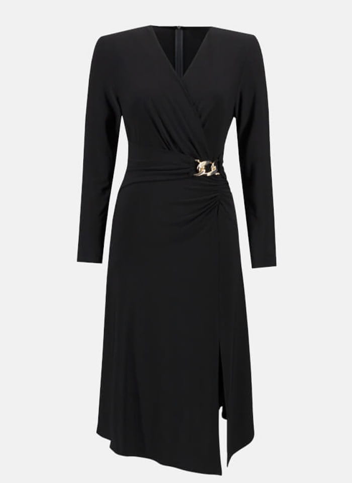 Joseph Ribkoff czarna sukienka midi z długim rękawem zdobiona złotą klamrą w pasie. Piękny, kobiecy dekolt w kształcie litery V, długość za kolano, fason lekko rozszerzany dołem z rozcięciem. Styl, klasa i elegancja, idealna na wiele okazji jako stylizacja wizytowa.