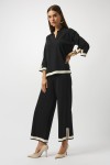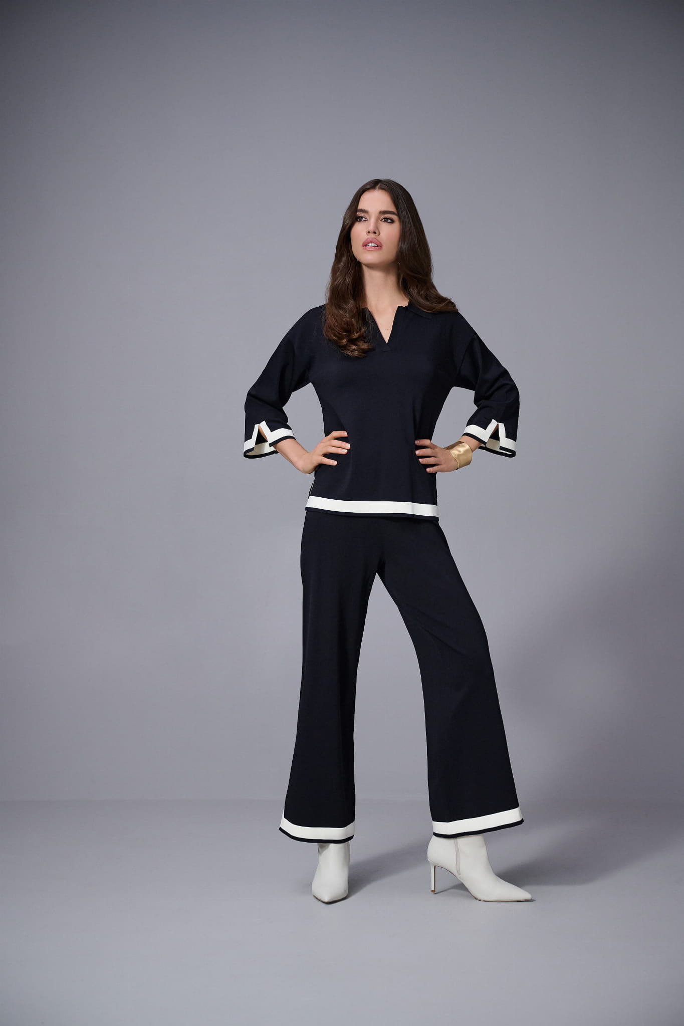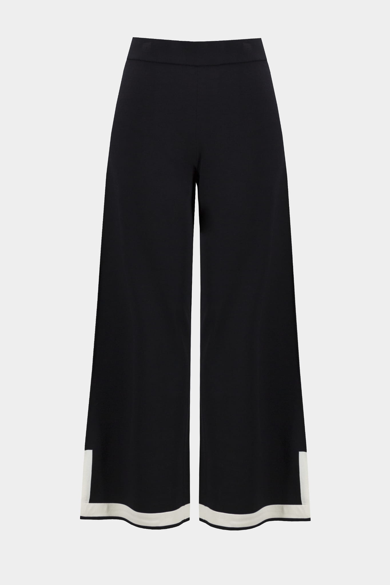 Joseph Ribkoff 253910 czarne spodnie długość 3/4 zdobione białą lamówką wykonane z wysokiej jakości tkaniny dzianinowej. Prosty, luźniejszy krój, szersza nogawka, długość 3/4 z subtelnym, delikatnym rozcięciem, wysokiej jakości tkanina oraz zestawienie czerni z bielą sprawiają, że w całej swojej prostocie są one niesamowicie stylowe i eleganckie. Do kompletu bluzka, numer kodu 253909. Idealny zestaw jako kreacja wizytowa.