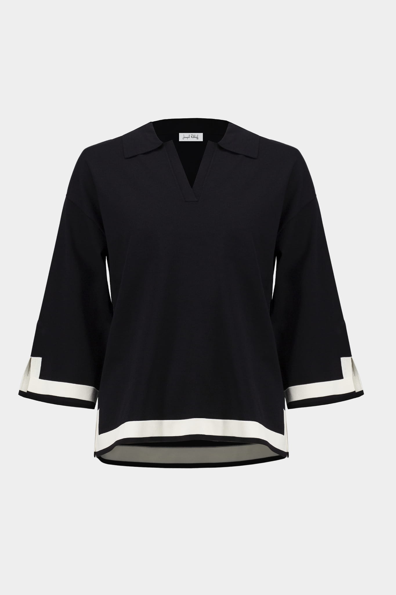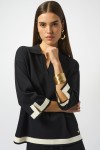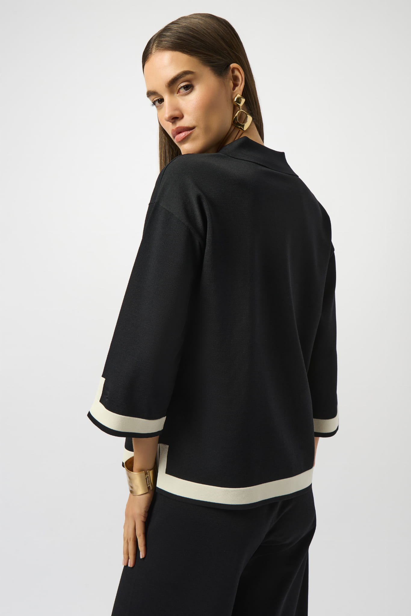 Joseph Ribkoff 253909 czarny sweter ze stylowej tkaniny dzianinowej z kołnierzykiem, pięknie zdobiony na dole i mankietach białą lamówką. Prosty, luźniejszy krój, rękaw 3/4 z subtelnym, delikatnym rozcięciem, wysokiej jakości tkanina oraz zestawienie czerni z bielą sprawiają, że w całej swojej prostocie jest on niesamowicie stylowy i elegancki. Do kompletu spodnie, numer kodu 253910. Idealny jako kreacja wizytowa.