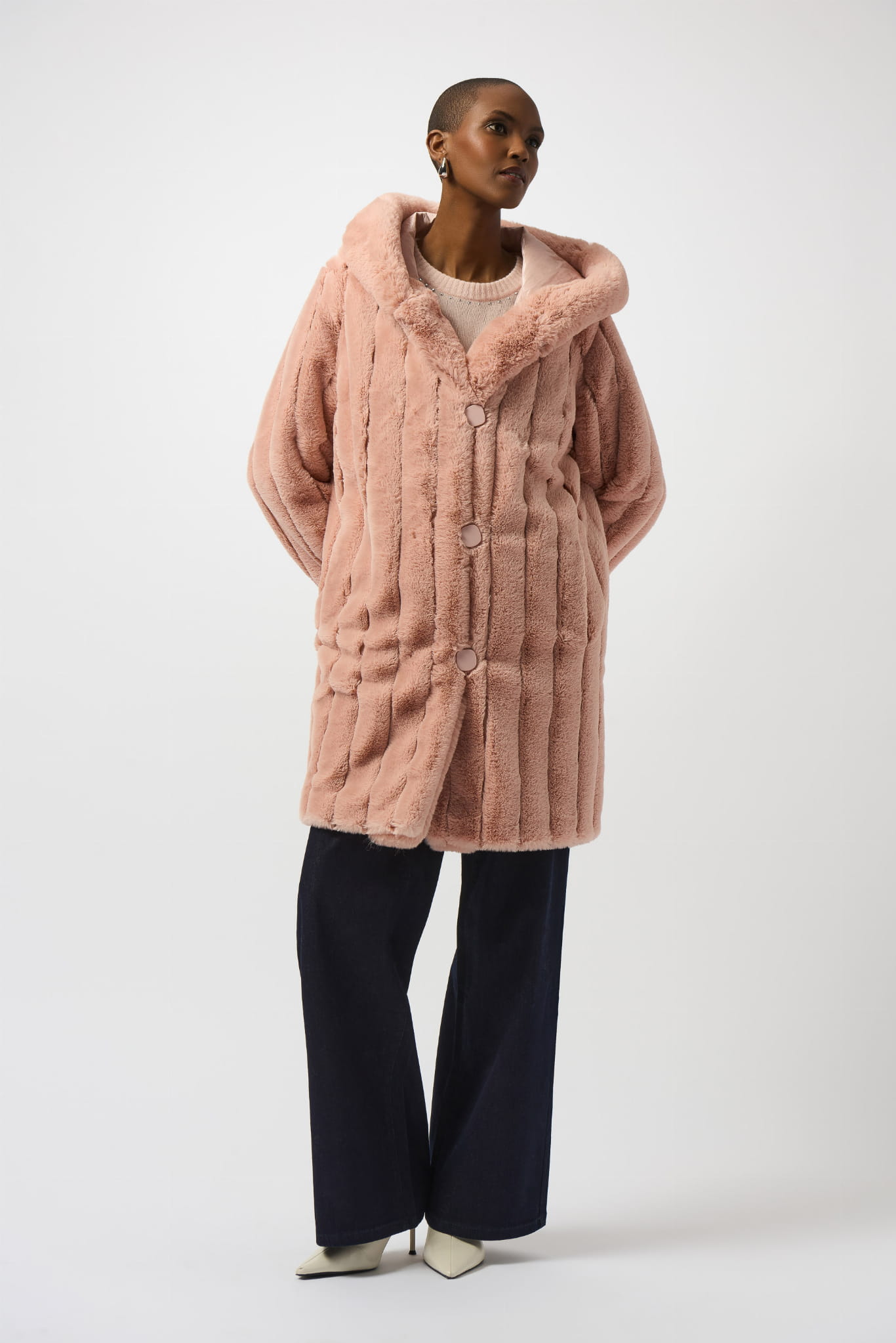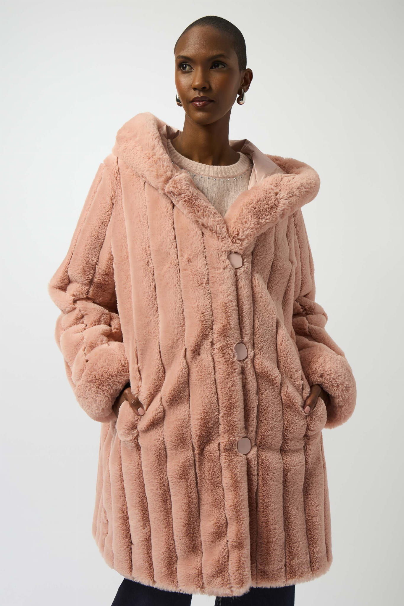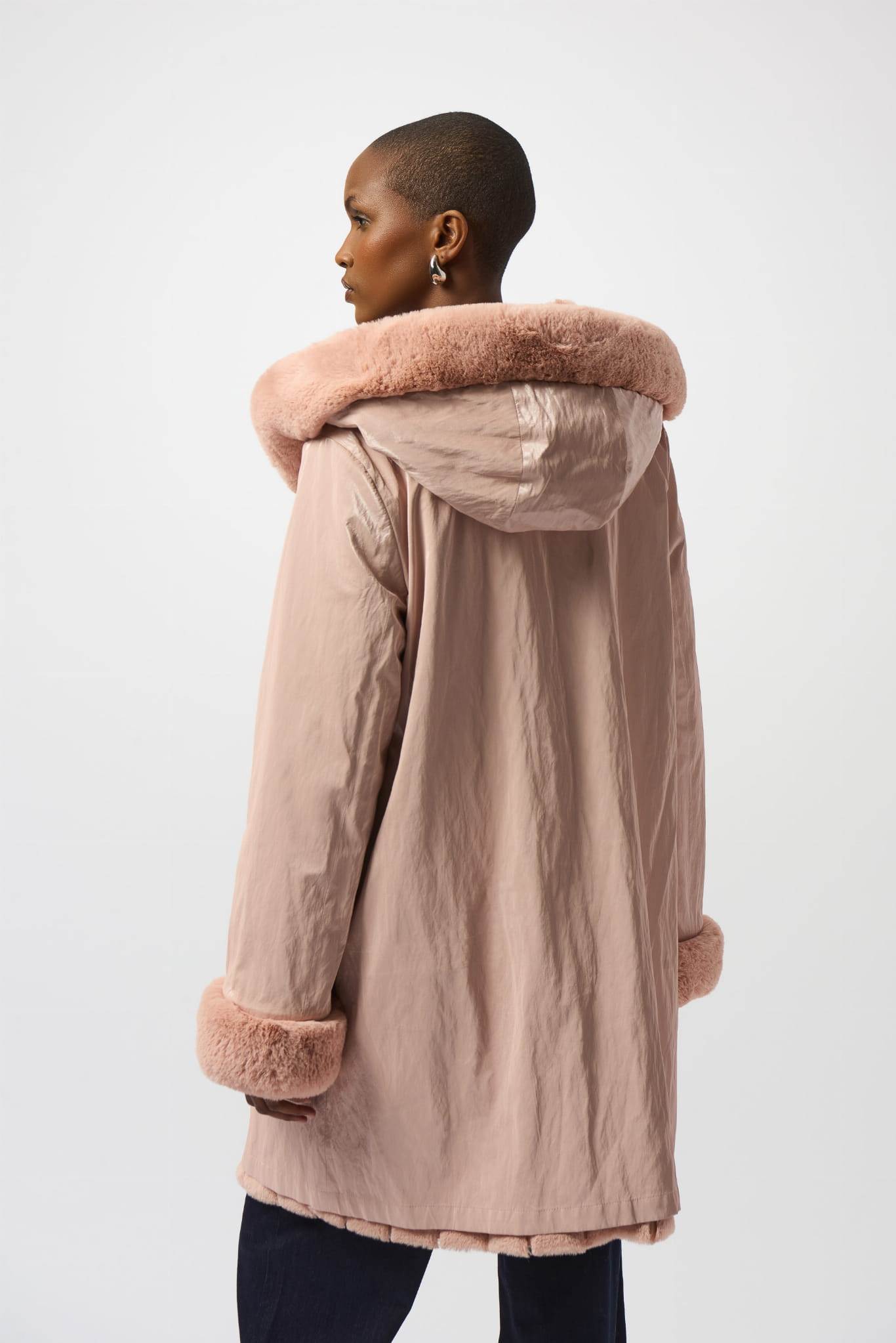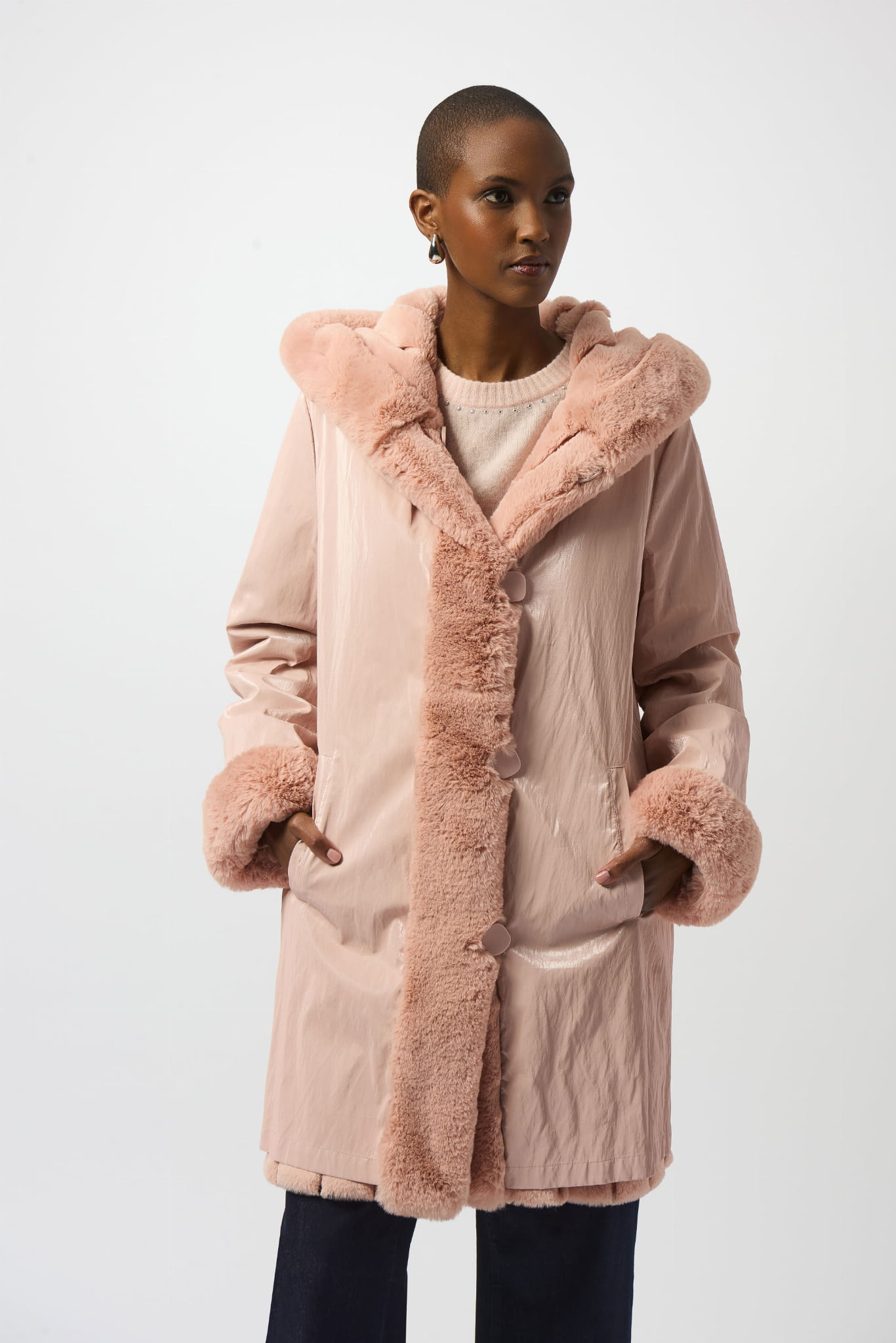 Joseph Ribkoff, Dwustronny płaszcz z kapturem zapinany na eleganckie, duże guziki w kolorze pudrowy róż. Na jednej stronie piękne, sztuczne futerko w pionowe przeszycia. Na drugiej stronie błyszcząca tkanina foliowa. Dla obu stron makiety i kaptur wykończone eleganckim futerkiem, które nadaje klasy i elegancki. Ciepły, wygodny i elegancki, poczujesz się w nim komfortowo i stylowo.