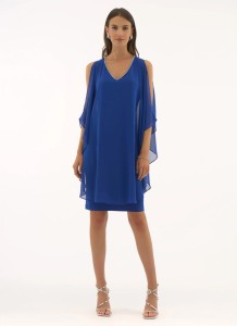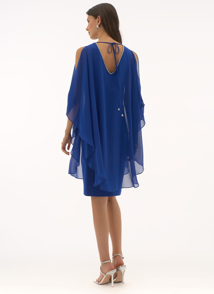 Joseph Ribkoff 251746 Elegancka, szafirowa sukienka. Dekolt w kształcie litery V, wykończony ozdobnymi kamieniami. Zwiewna pelerynka nadaje jej wyjątkowy i niepowtarzalny charakter. Idealna jako stylizacja wizytowa.