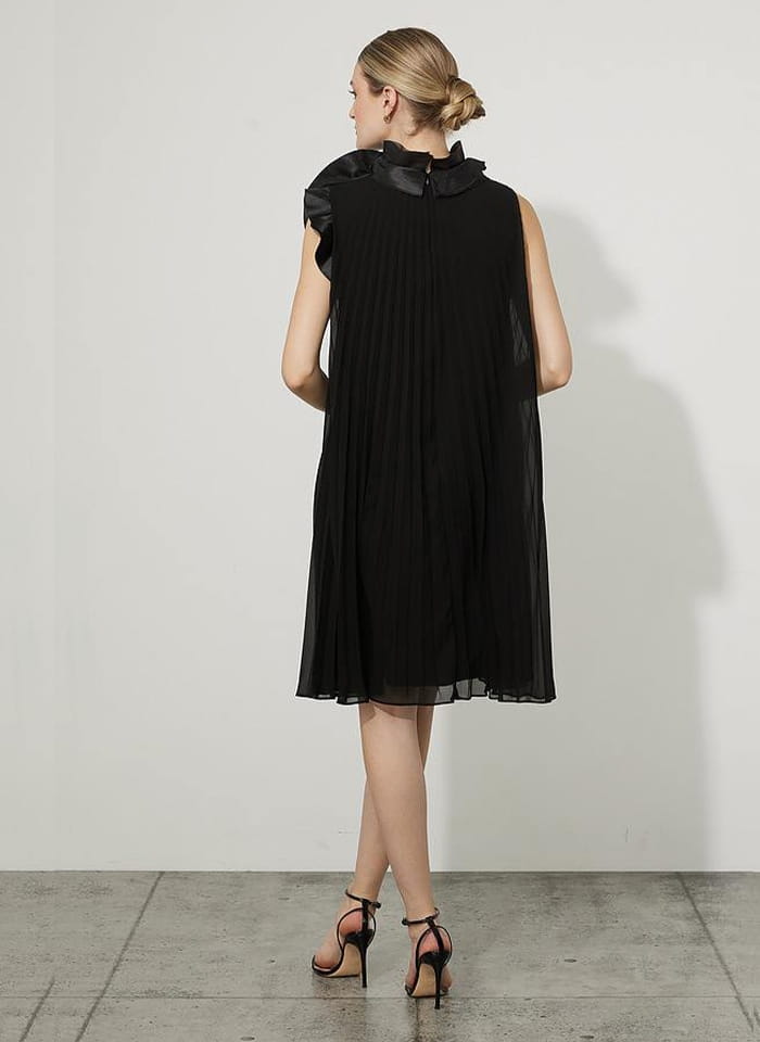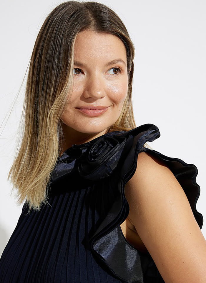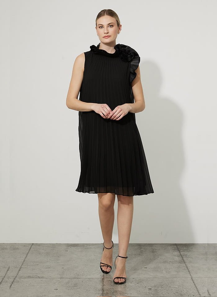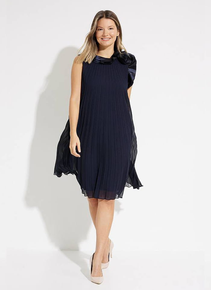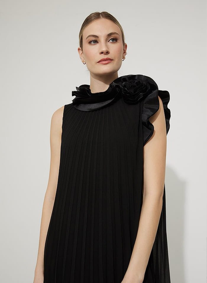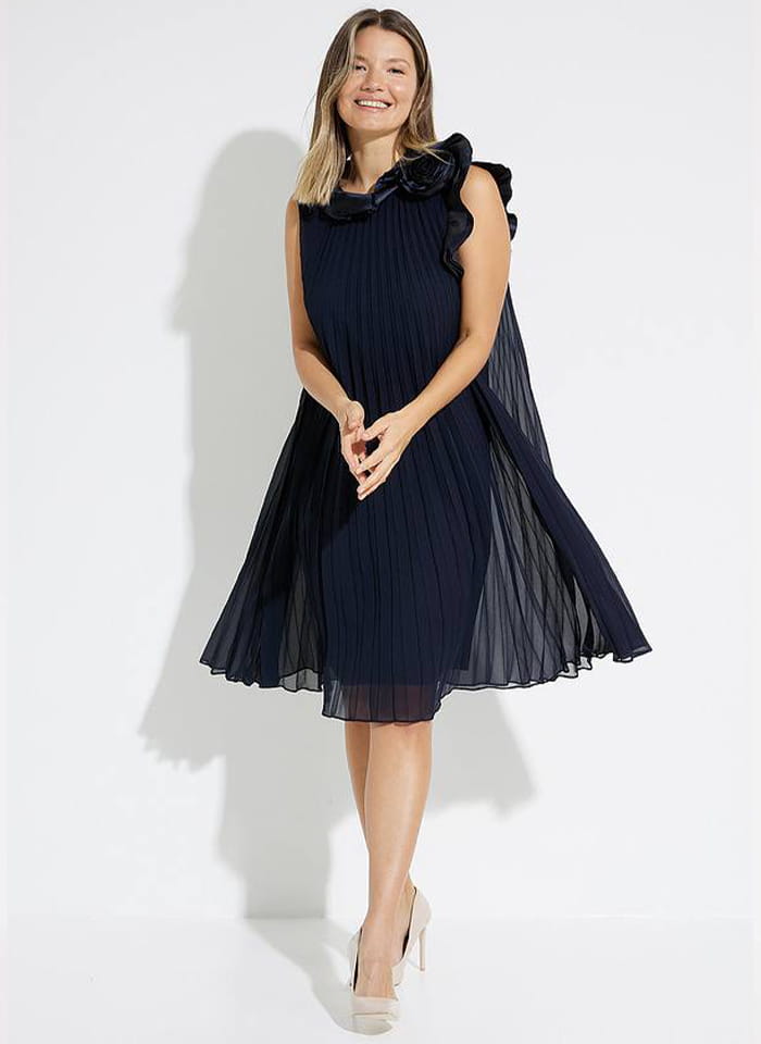 Joseph Ribkoff elegancka sukienka w plisy w kolorze czarnym i granatowym 223728. Fason prosty, tiul w plisy rozszerzany do doły, długość do kolana. Bez rękawów, przy dekolcie zdobiona zjawiskowym kwiatem. Bardzo oryginalna i stylowa, idealna jako kreacja wizytowa i wieczorowa.