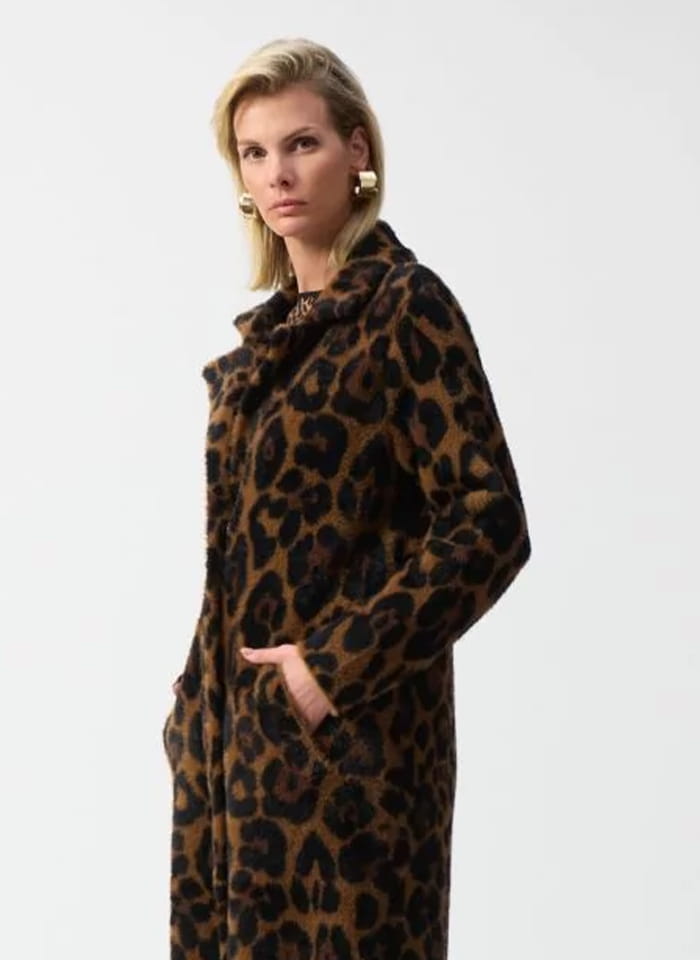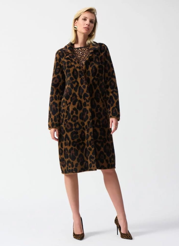 Joseph Ribkoff 244956 Futerkowy płaszcz w panterkę w kolorach czerni i brązu. Prosty krój, elegancki kołnierz z klapami, z przodu dwie kieszenie, zapinany na kryte napy. Wykonany z miękkiej futerkowej dzianiny, ciepłej i przyjemnej w dotyku. Nada Twoim stylizacjom pazura i sprawi, że będziesz w nim wyglądała efektownie, stylowo i czuła się komfortowo.