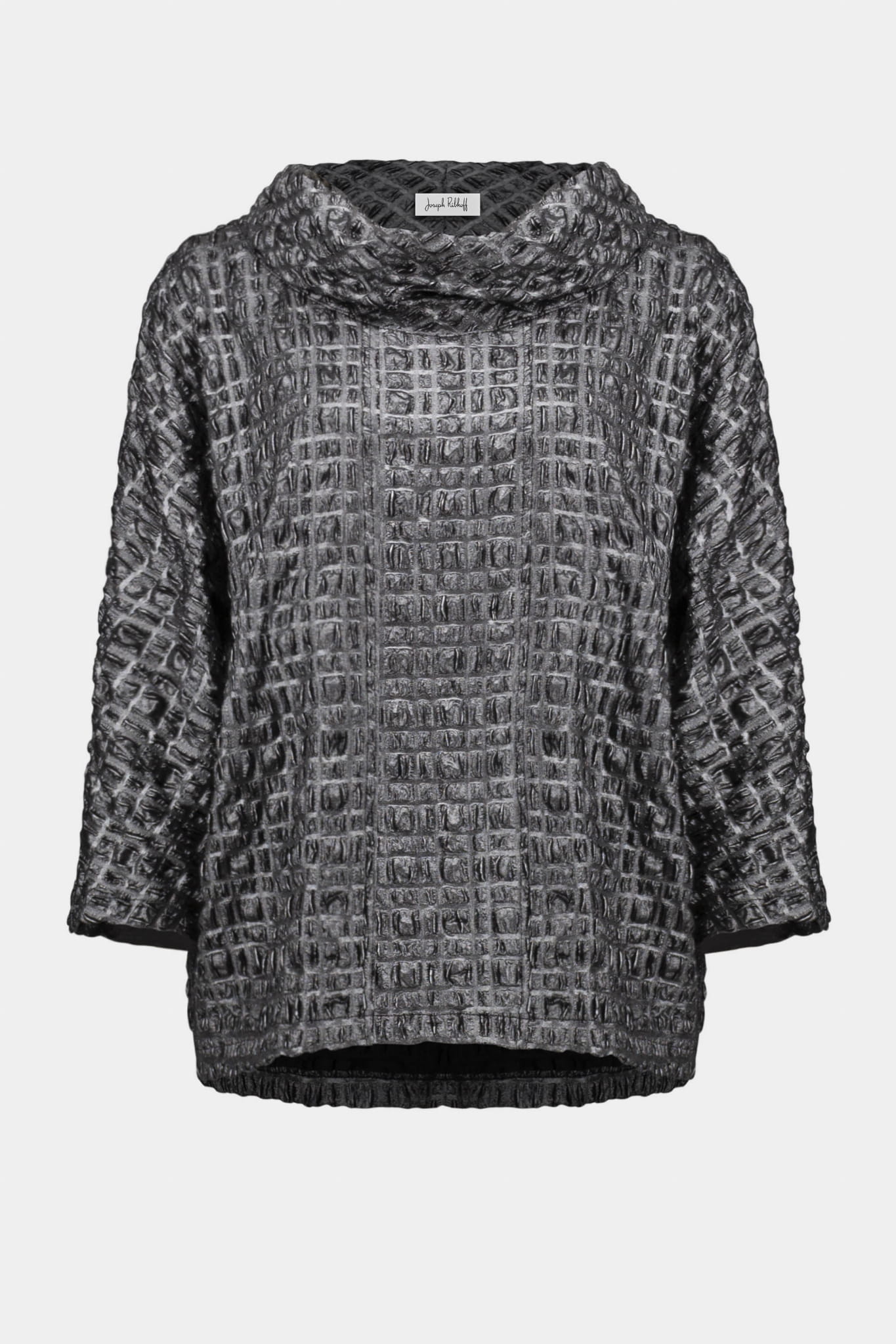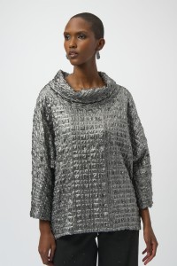 Joseph Ribkoff 254169 grafitowa połyskująca bluzka z półgolfem z marszczonej tkaniny. Bardzo oryginalna, szyk, klasa i elegancja w jednym. Idealna jako element stylizacji wieczorowej i wizytowej.