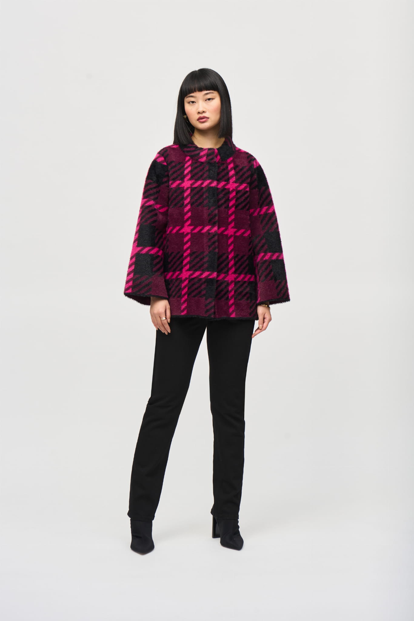 Joseph Ribkoff 243931 stylowa kurtka z futerkowej tkaniny w bordowo-różową kratę.