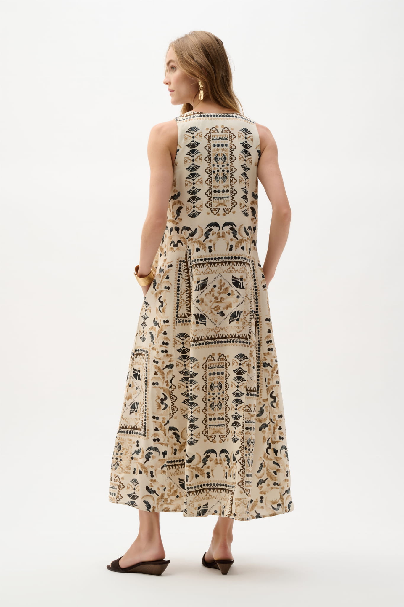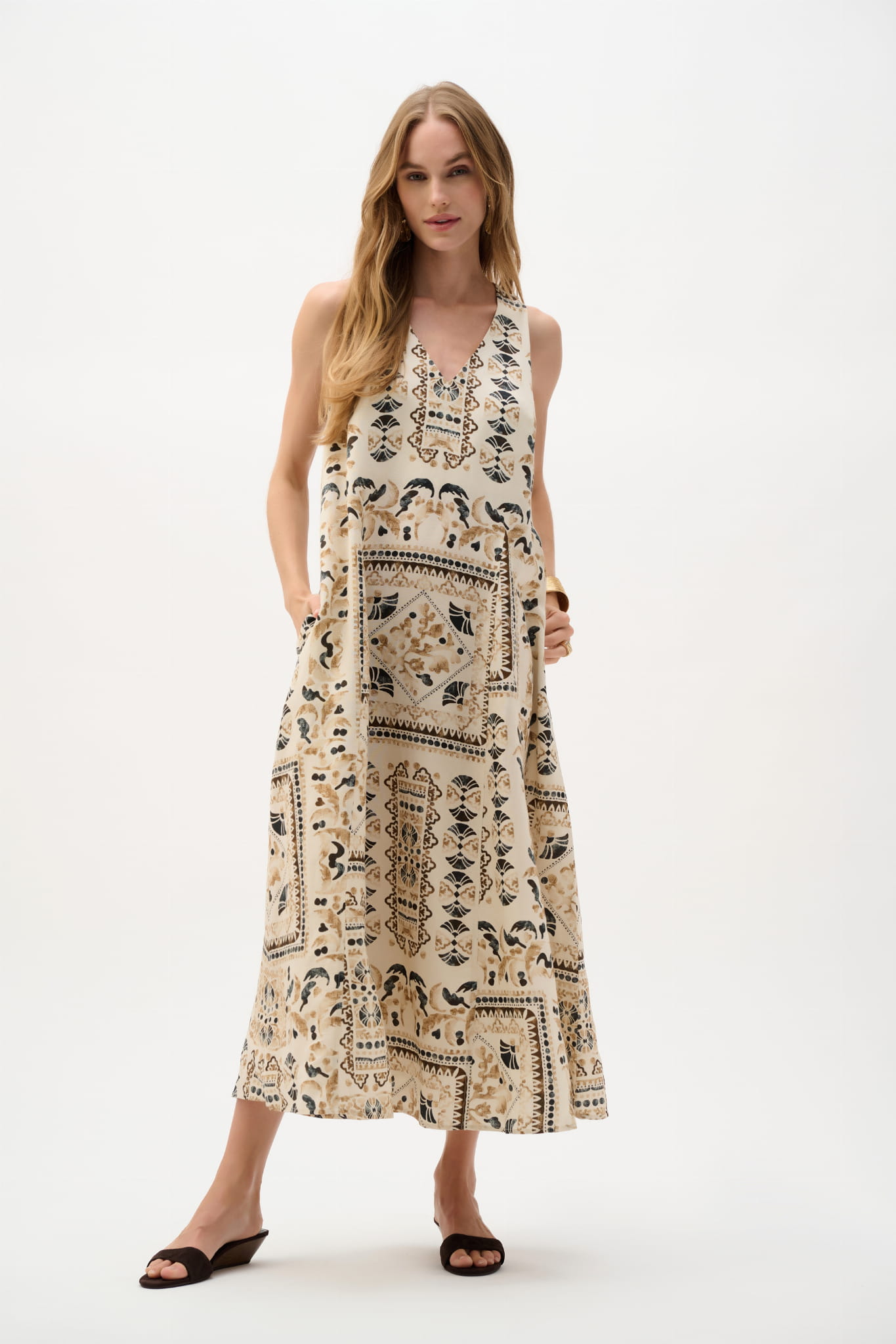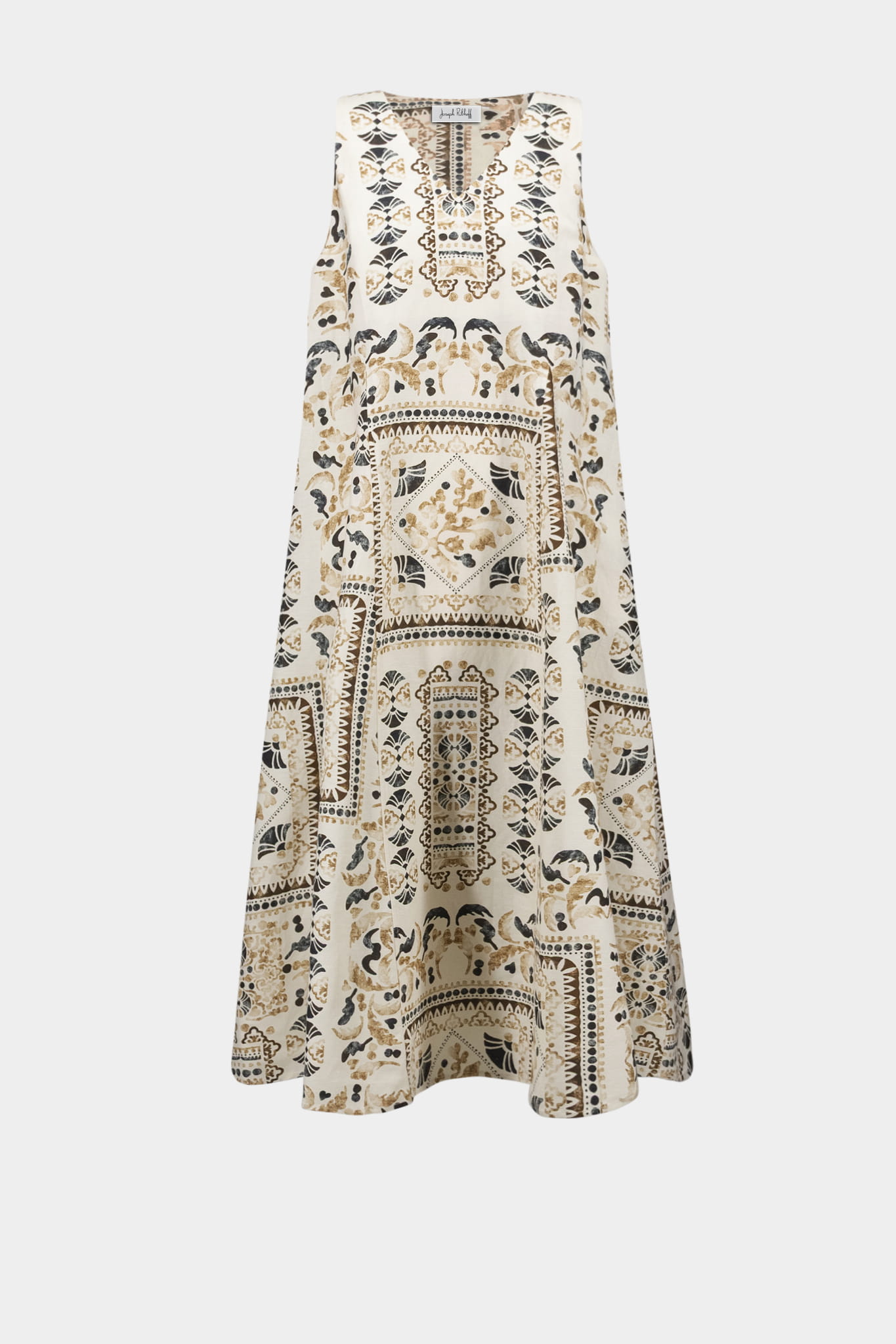 Joseph Ribkoff 262908 przepiękna, lniana sukienka w stylu boho w beżowym kolorze, z oryginalny wzorem boho na całości. Model o luźnym kroju z dekoltem w szpic, na szerszych ramiączkach. Piękna, subtelna i zwiewna. Idealna na wiosnę i lato.