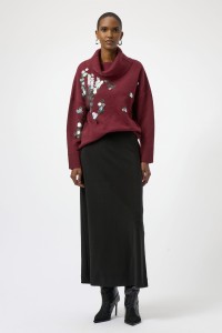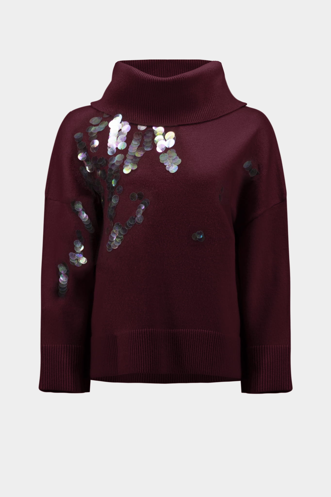 Joseph Ribkoff 254942 Piękny bordowy golf zdobiony dużymi cekinami. Fason prosty z golfem, długim rękawem, rozcięciami po bokach oraz oryginalnym zdobieniem z dużych cekinów. Niesamowicie oryginalny i twarzowy. Miękki, ciepły, komfortowy a przy tym pełen klasy i elegancji. Podaruj sobie odrobinę luksusu na te chłodne dni.