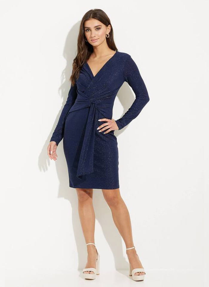 Joseph Ribkoff 231763 Połyskująca sukienka z ozdobną falbaną w kolorze lub granatowym. Piękny dekolt w kształcie litery V, pełne plecy, długość do kolan. Fason bardzo kobiecy dopasowany do sylwetki. Elegancka, miękka i elastyczna tkanina zapewnia swobodę ruchów, sprawia, że suknia jest niesamowicie stylowa i elegancka a jednocześnie bardzo wygodna i komfortowa. Idealna jak stylizacja wieczorowa czy wizytowa, w której będziesz błyszczeć i wyglądać oszałamiająco.