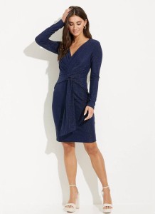 Joseph Ribkoff 231763 Połyskująca sukienka z długim rękawem do kolan w kolorze beżowym lub granatowym.