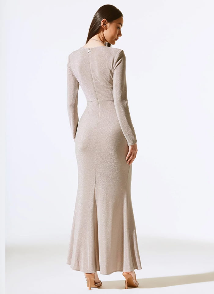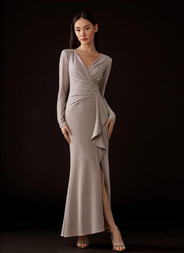 Joseph Ribkoff, Połyskująca suknia z ozdobną falbaną w beżowym kolorze ze srebrną nitką. Piękny dekolt w kształcie litery V, pełne plecy, długa do kostek. Fason w kształcie syrenki lekko rozszerzony dołem. Elegancka, miękka i elastyczna tkanina zapewnia swobodę ruchów, sprawia, że suknia jest niesamowicie stylowa i elegancka a jednocześnie bardzo wygodna i komfortowa. Idealna jak stylizacja wieczorowa czy wizytowa, w której będziesz błyszczeć i wyglądać oszałamiająco.