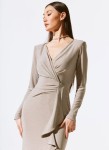 Joseph Ribkoff 243793 Połyskująca suknia z ozdobną falbaną w kolorze jasno beżowym.