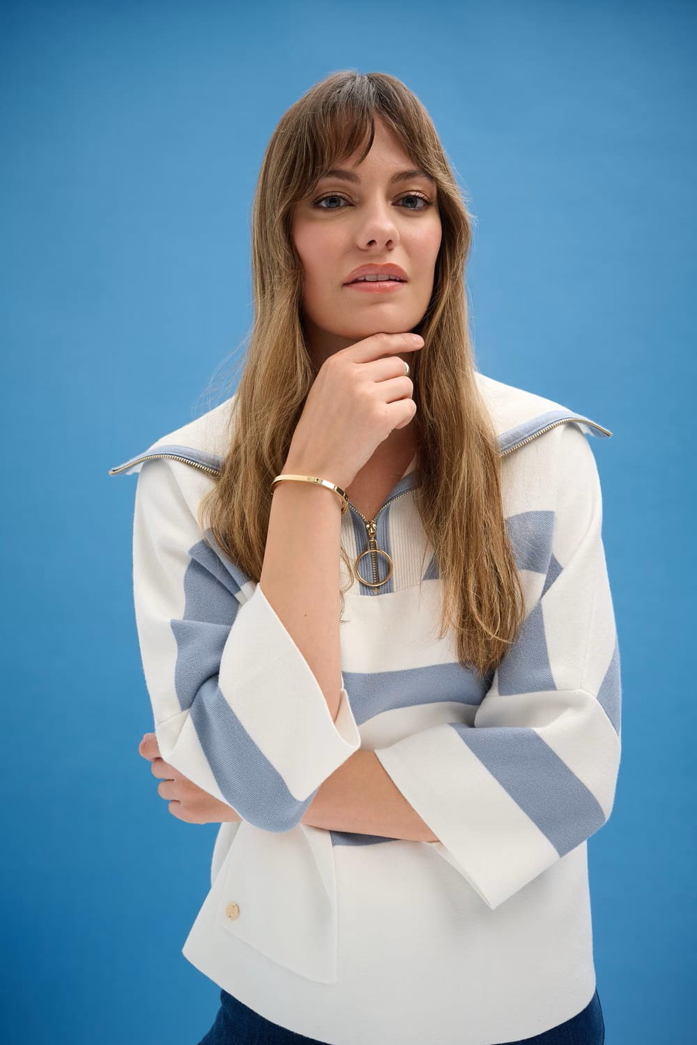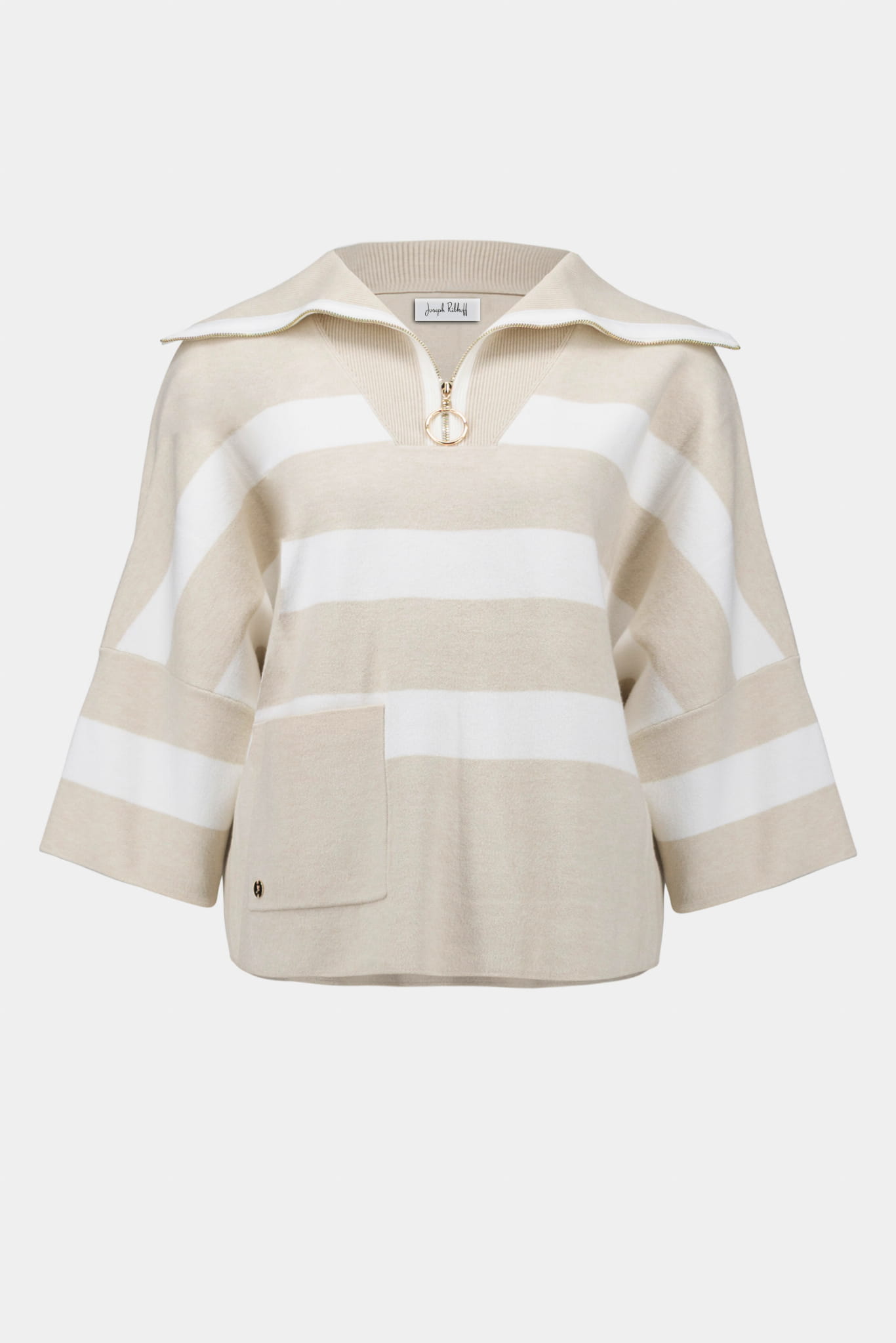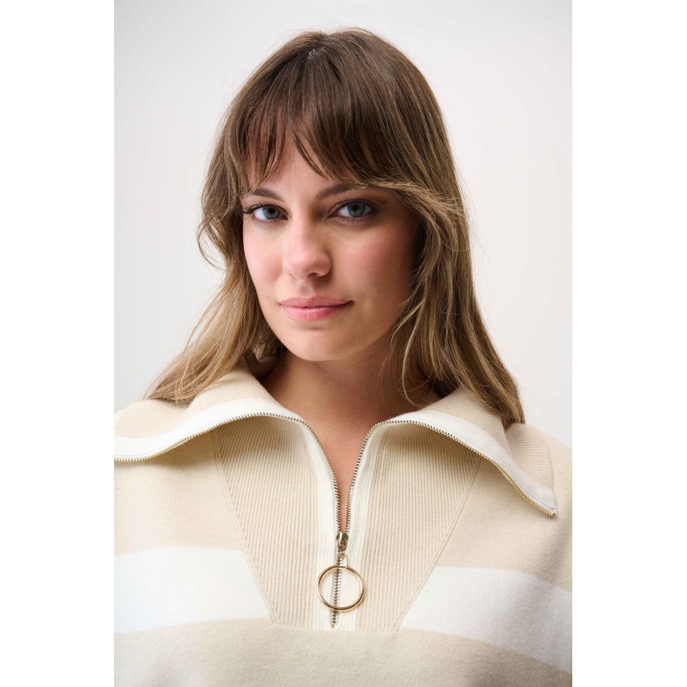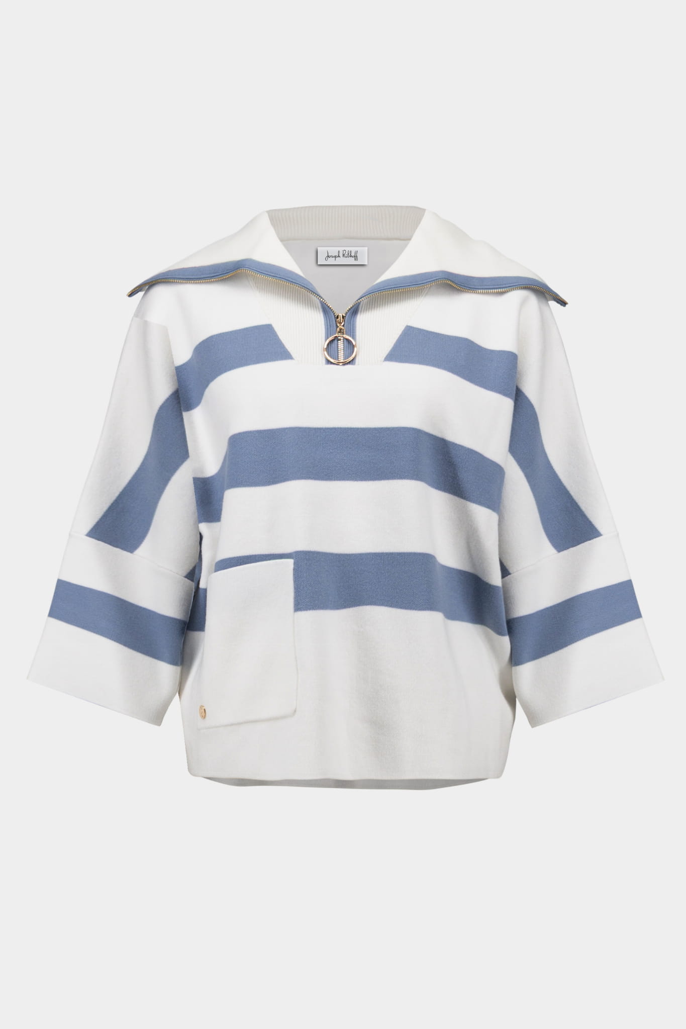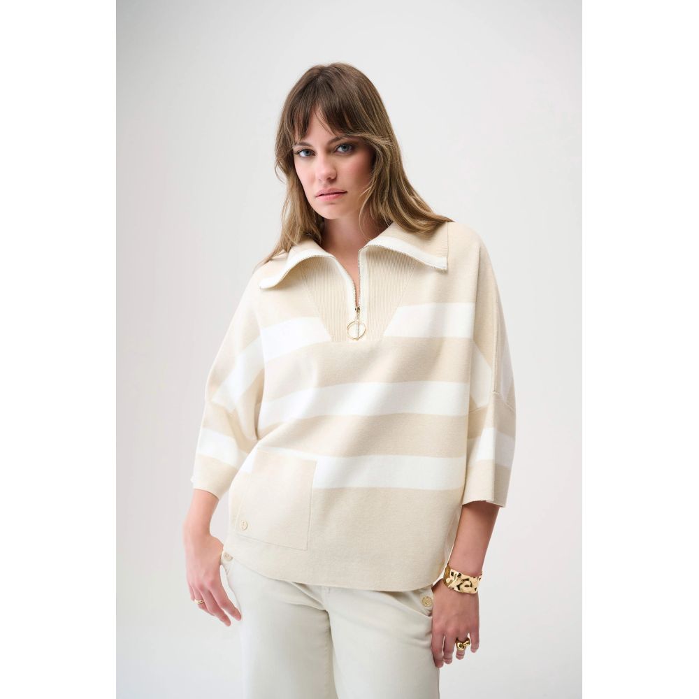Joseph Ribkoff 261983 Pudełkowy sweter w szerokie, białe pasy w kolorze beżowym lub niebieskim. Krój pudełkowy z rozpinanym kołnierzem i niżej wszywanym rękawem. Z przodu elegancka kieszonka, zamek i logo w kolorze złotym dodają mu klasy i elegancji. Wykonany z przyjemnej dotyku tkaniny. Poczujesz się w nim stylowo i pięknie.
