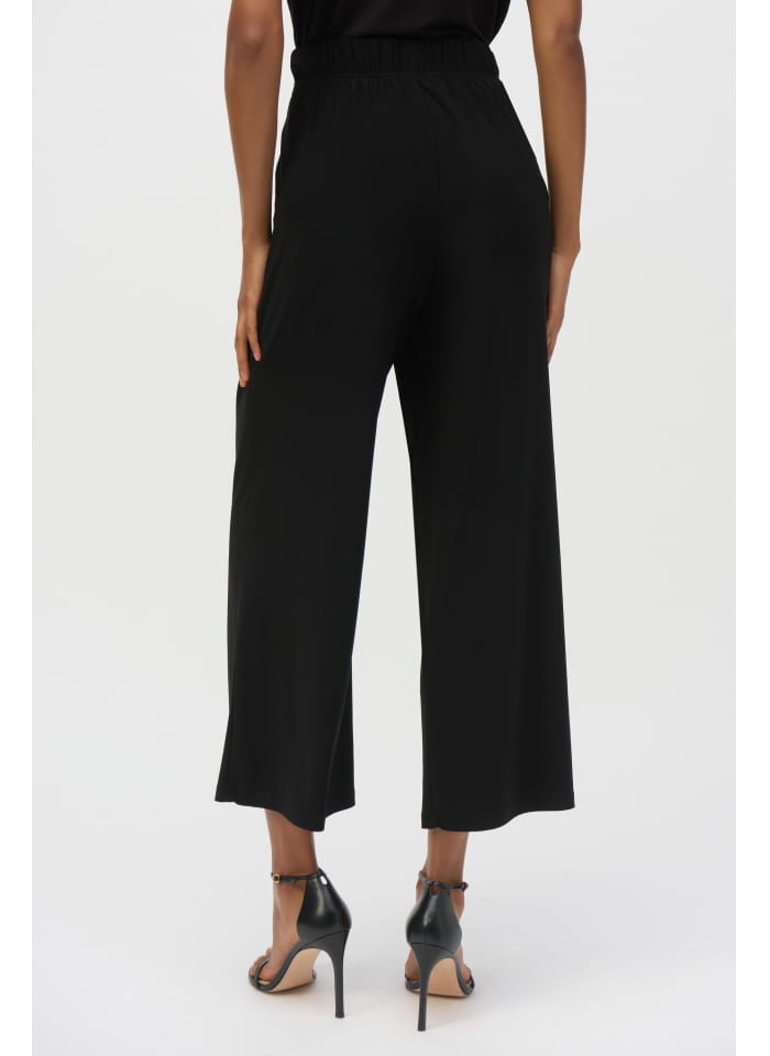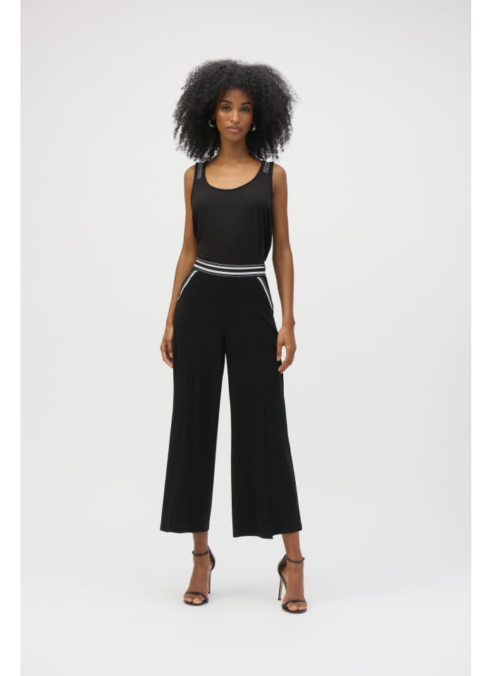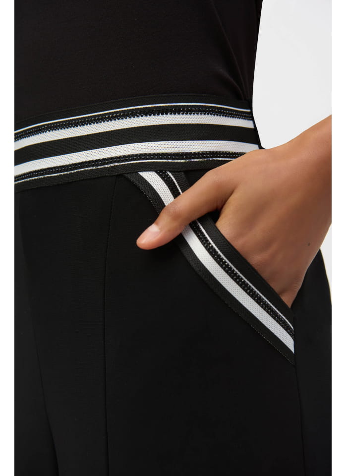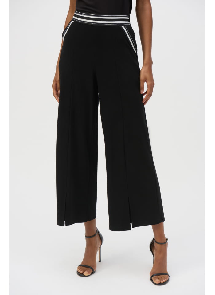 Joseph Ribkoff 252153 Spodnie kuloty, czarne z rozcięciem za nogawce z przodu, pas z piękną czarno-białą lamówką.