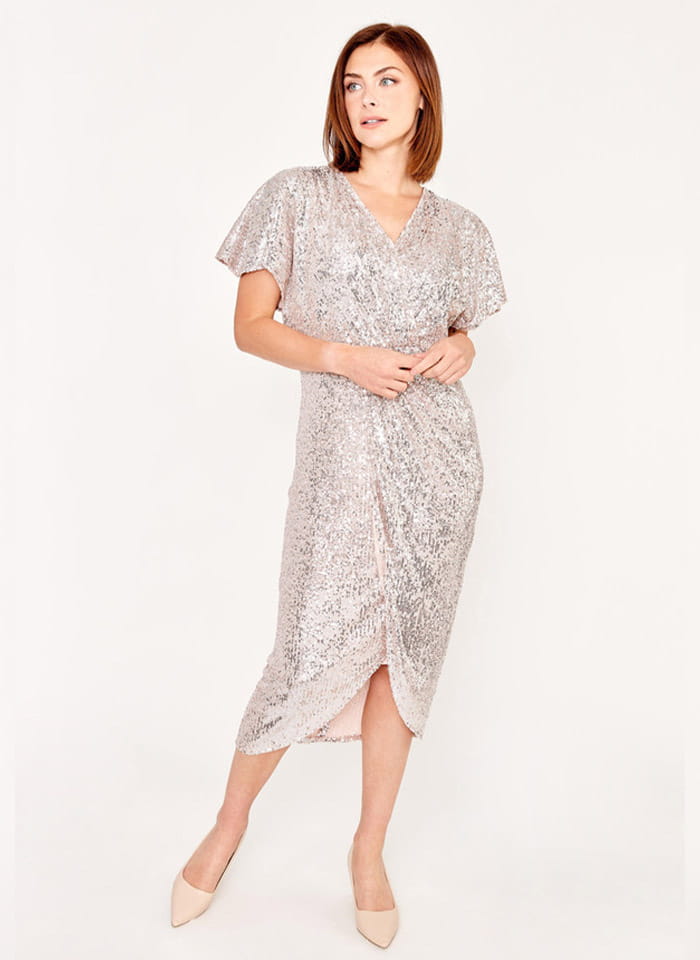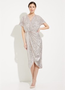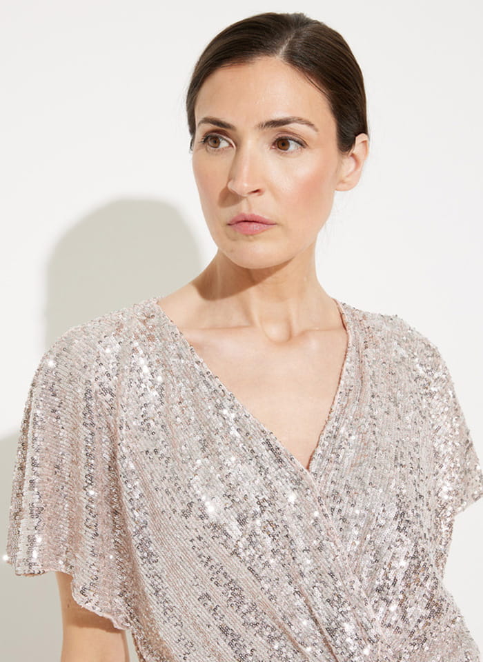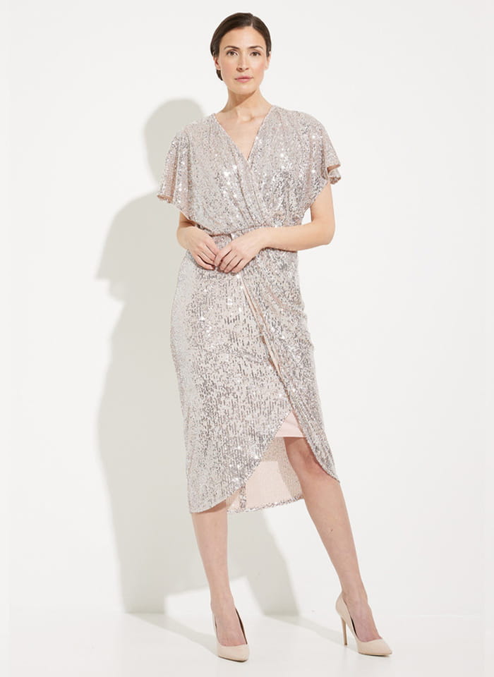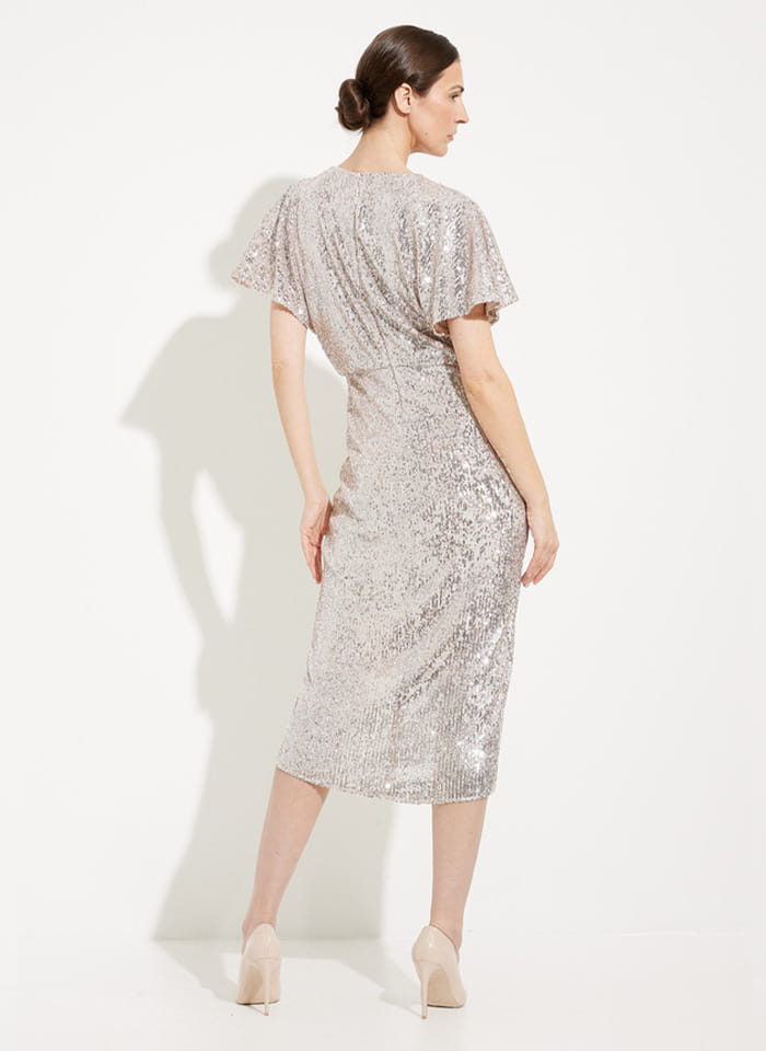 Joseph Ribkoff 231760 srebrna sukienka w cekiny, dekolt w kształcie litery V, krótki rękaw, zakładana z przodu, długość za kolano.