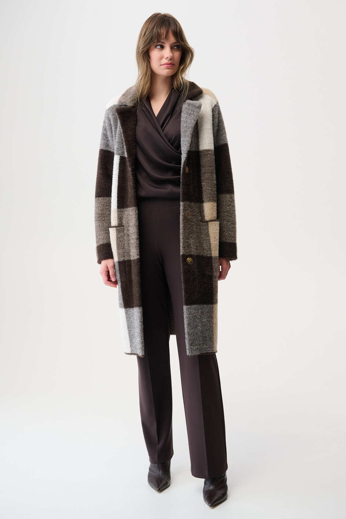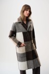 Joseph Ribkoff 254975 Stylowy płaszcz w kratę w odcieniach brązu, beżu i bieli.