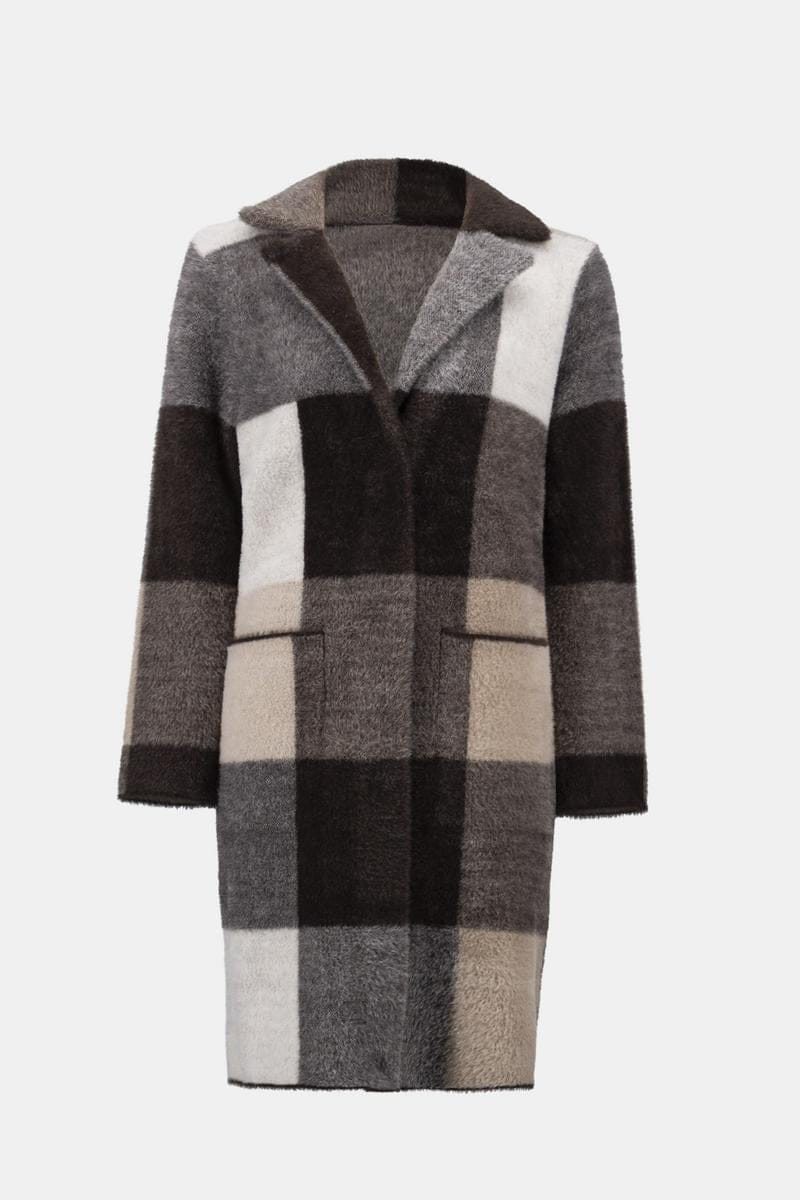 Joseph Ribkoff 254975 Stylowy płaszcz w kratę w odcieniach brązu, beżu i bieli. Fason lekki oversize z klasycznymi klapami i zapięciem na zatrzaski. Z przodu dwie, eleganckie wsuwane kieszenie. Miła w dotyku, miękka i ciepła tkanina oraz oryginalny wzór w kratę w odcieniach brązu, beżu i bieli sprawiają, że jest on bardzo oryginalny i niepowtarzalny. Otuli Cię w chłodne dni i sprawi, że poczujesz się stylowo, kobieco i pięknie.