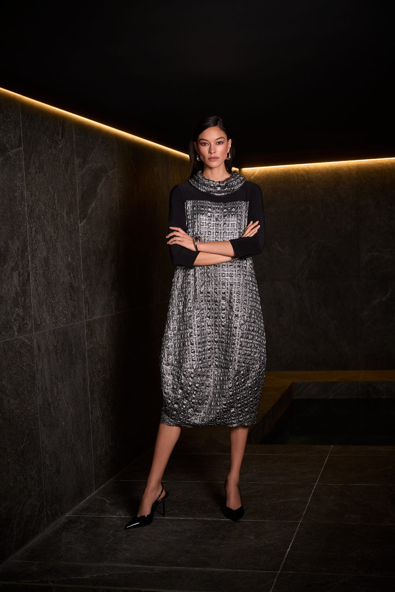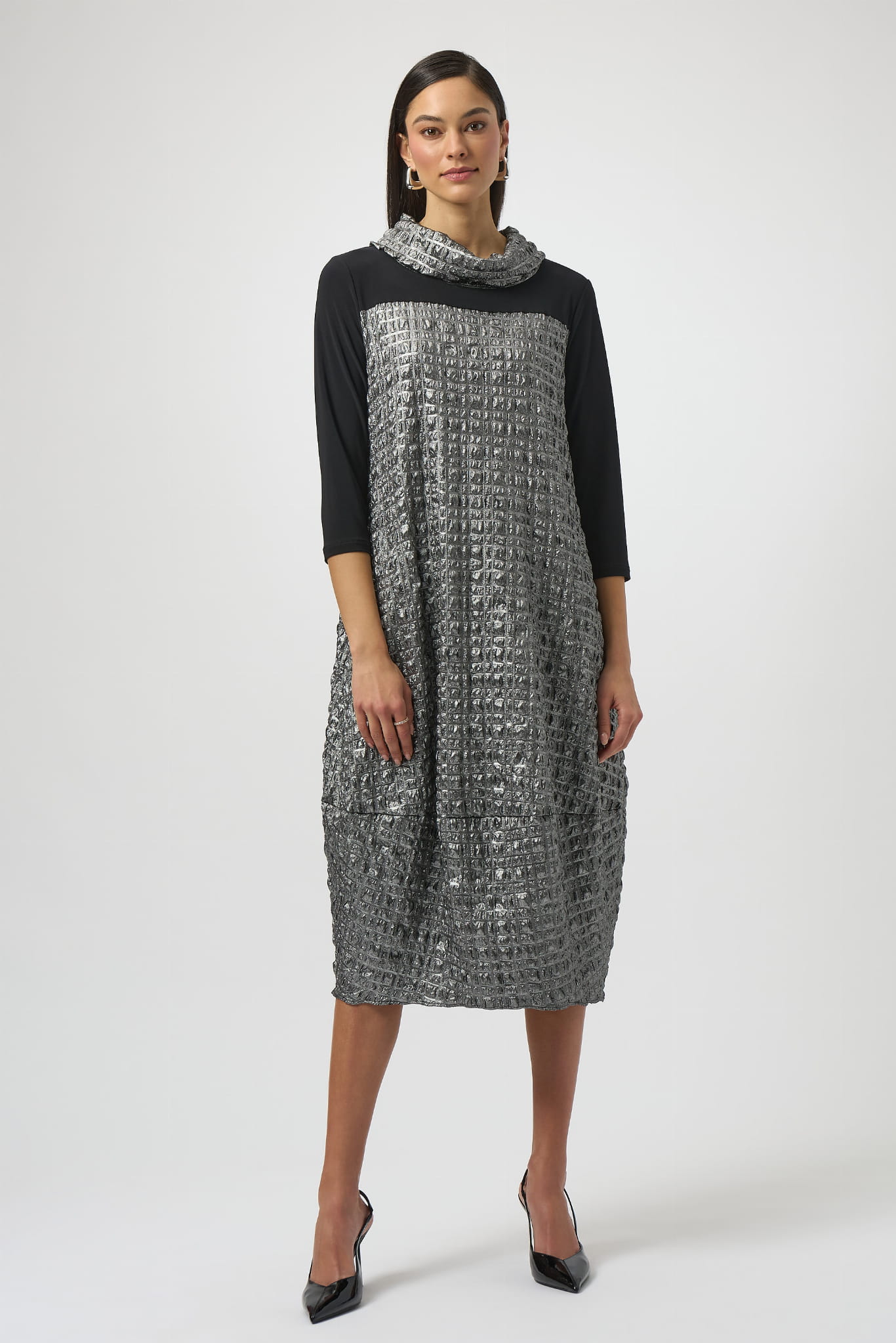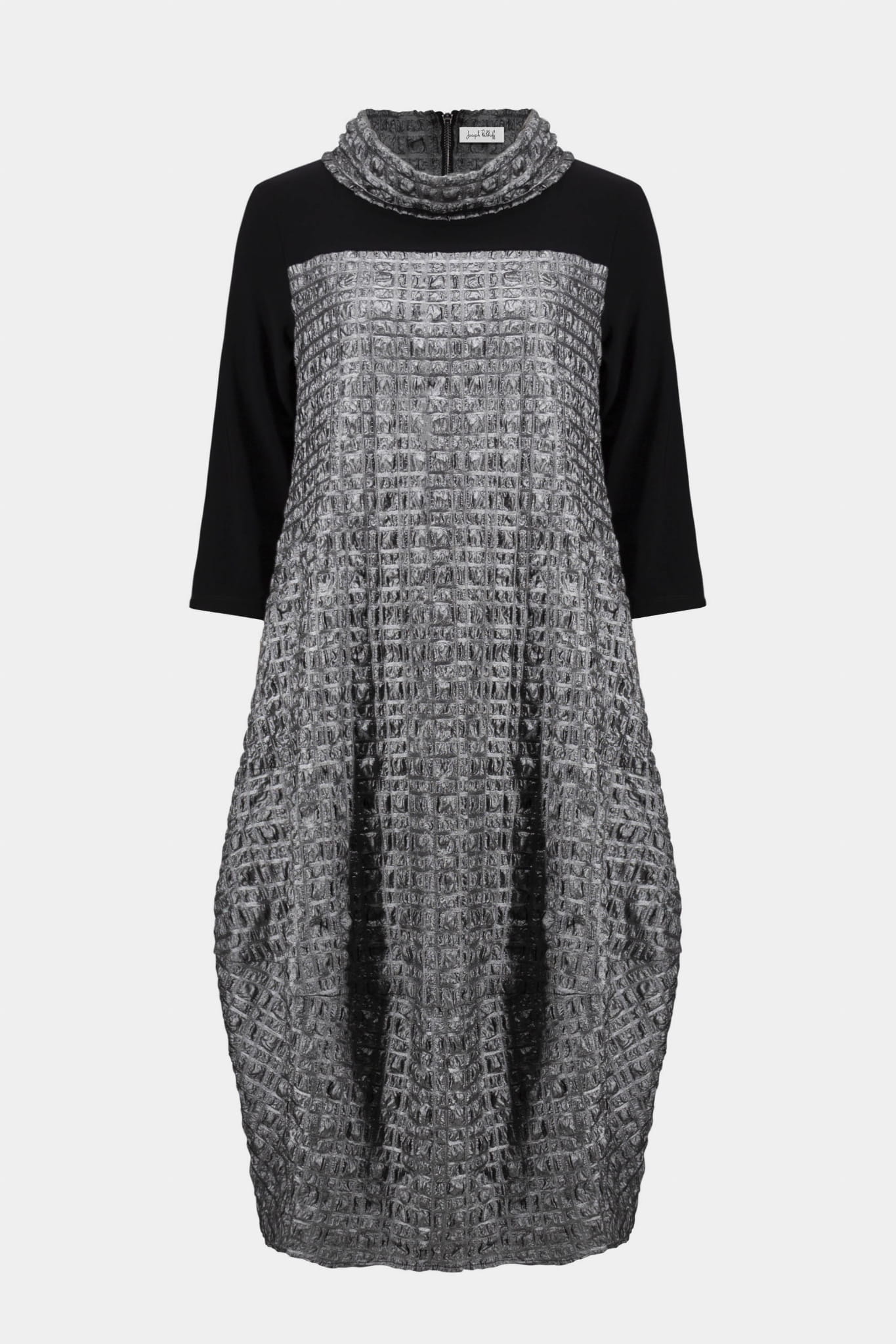 Joseph Ribkoff 254057 oryginalna sukienka czarno-grafitowa. Niepowtarzalny fason, luźny krój, rękaw 3/4 i półgolf. Piękne łączenie dwóch takin, głatkiej, czarnej tkaniny, z połyskującą, marszczoną grafitową. Po bokach wszyte kieszenie, które nadają jej nieco sportowy look. Idealna jako kreacja wizytowa, elegancka, pełna klasy i jednocześnie komfortowa.