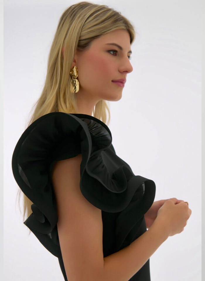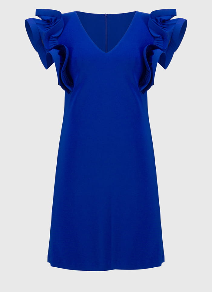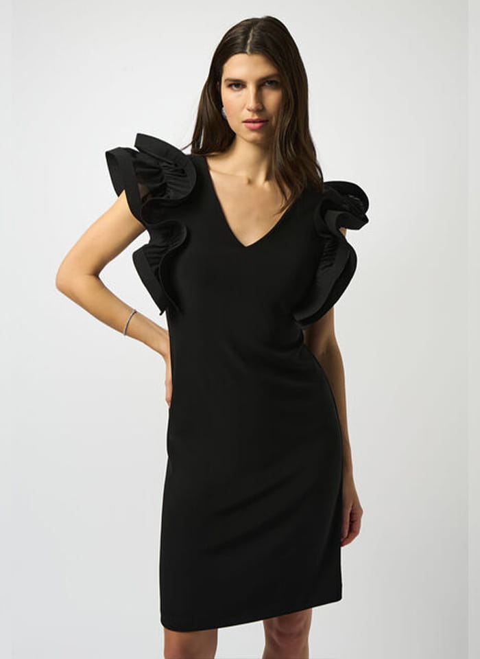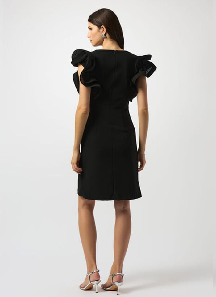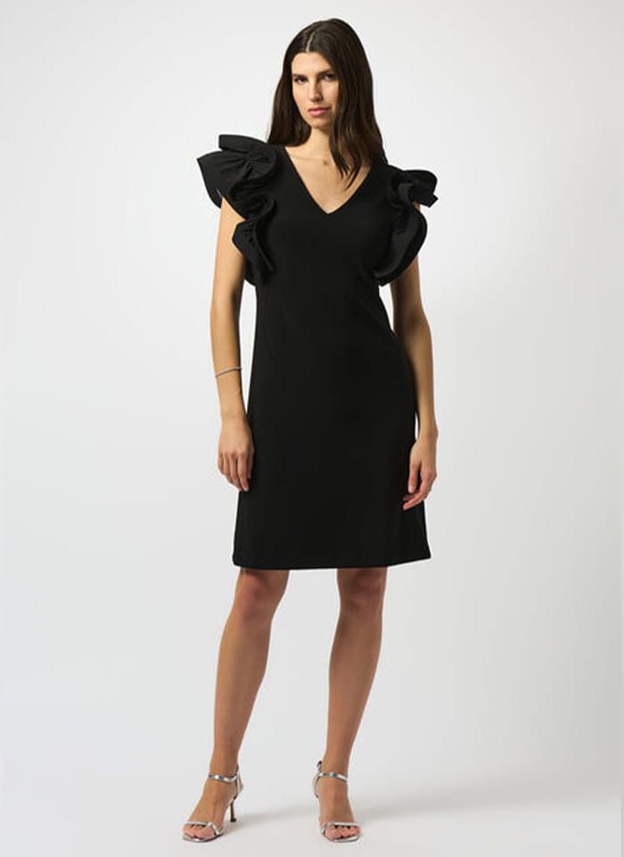 Joseph Ribkoff 251733 Sukienka z efektownym rękawkiem, dostępna w dwóch kolorach szafirowym i czarnym. Dekolt w kształcie litery V, długość przed kolano. Bardzo oryginale rękawki ala motyl nadają jej wyjątkowy i niepowtarzalny look. Idealna jako stylizacja wizytowa i wieczorowa, dostępna w większych rozmiarach.