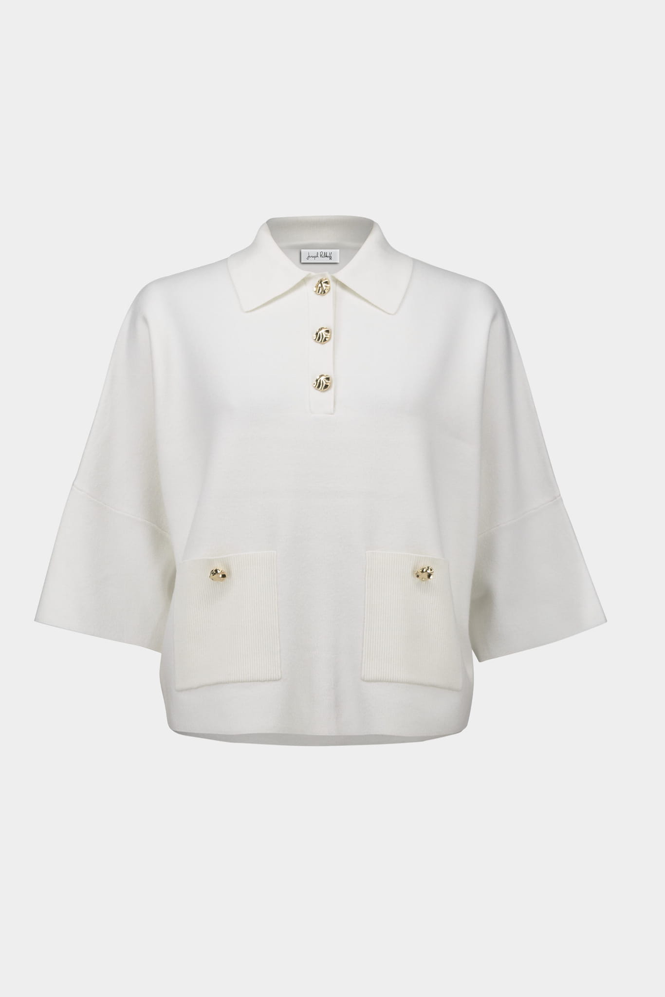 Joseph Ribkoff 253962 Sweter z kołnierzykiem w kolorze kremowym. Wykonany z tkaniny miękkiej i mięsistej o wysokiej zawartości wiskozy. Prosty fason, dekolt z kołnierzykiem zapinany na eleganckie, złote guziki. Proste, szersze rękawy o długości 3/4. Z przodu dwie kieszenie pięknie zdobione złotymi guzikami. Idealny jako stylizacja do pracy. Poczujesz się w nim kobieco i z klasą.