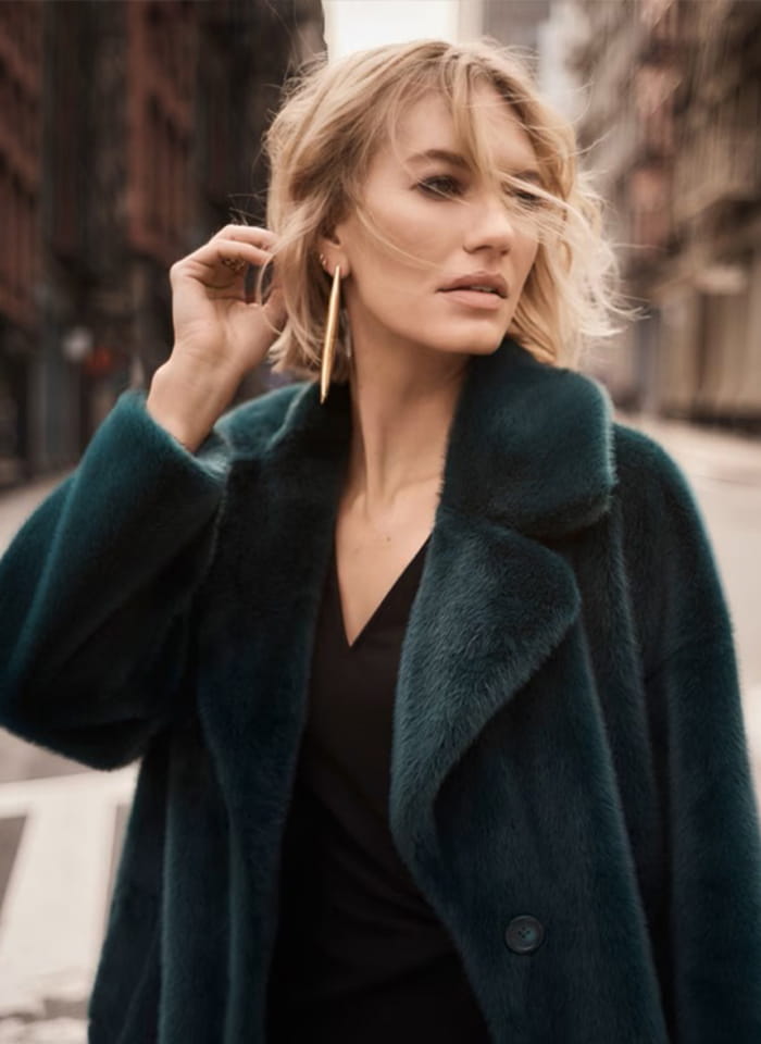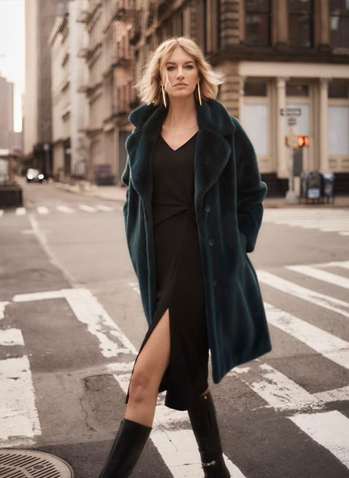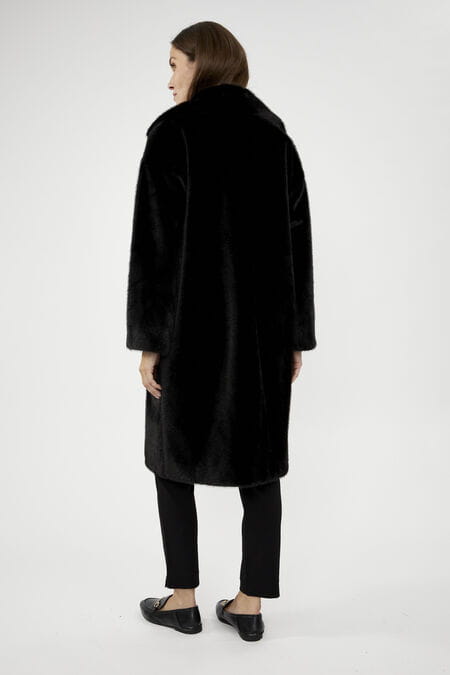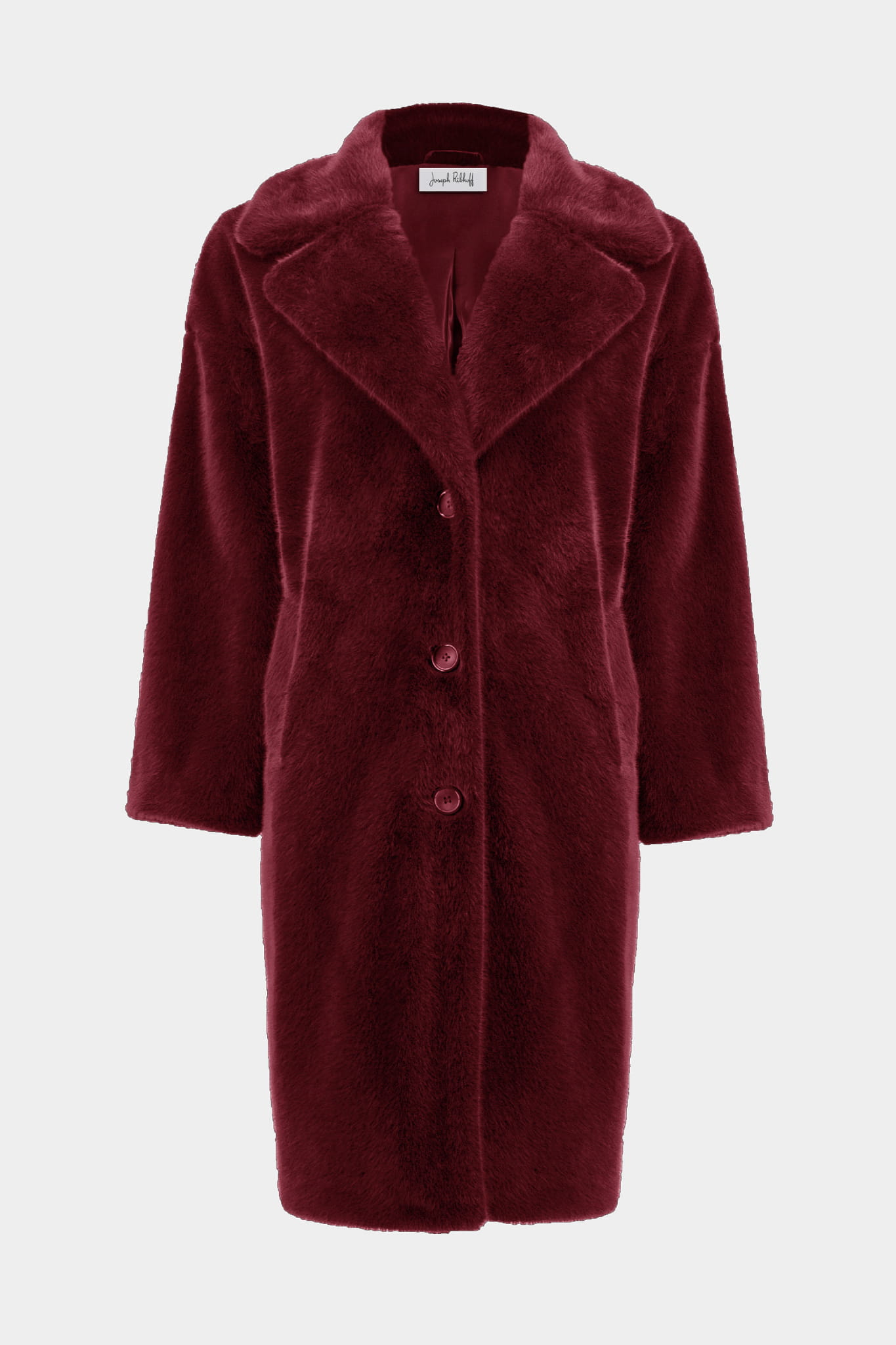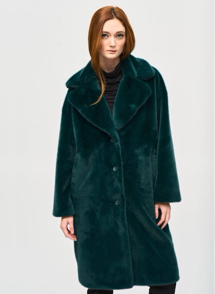 Joseph Ribkoff 243902 Sztuczne futerko z wykładanym kołnierzem dostępne w trzech kolorach - butelkowa zieleń, czarny i bordo. Futerko o klasycznym prostym kroju z kieszeniami, zapinane na guziki. Ciepłe, bardzo wygodne i niezwykle eleganckie. Idealne na jesień i zimę.