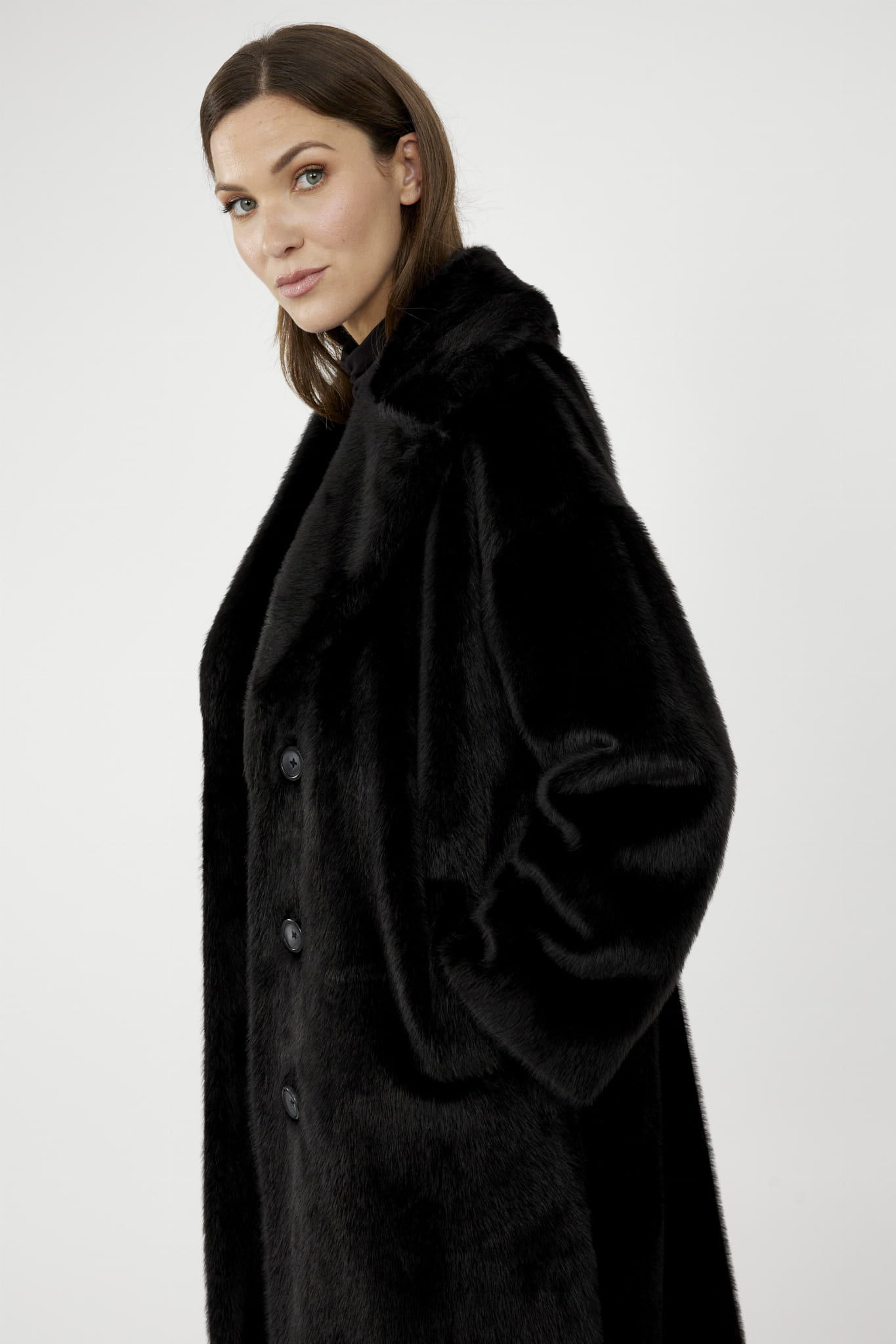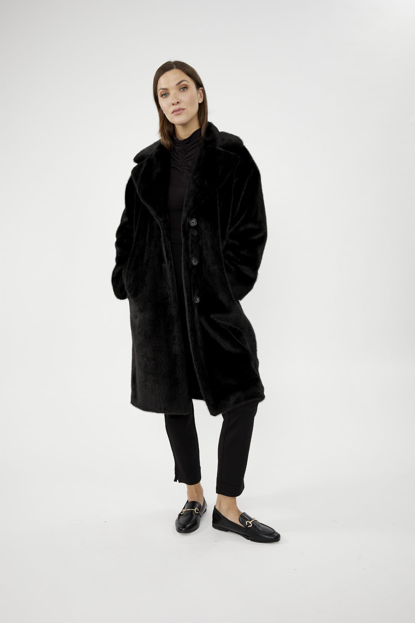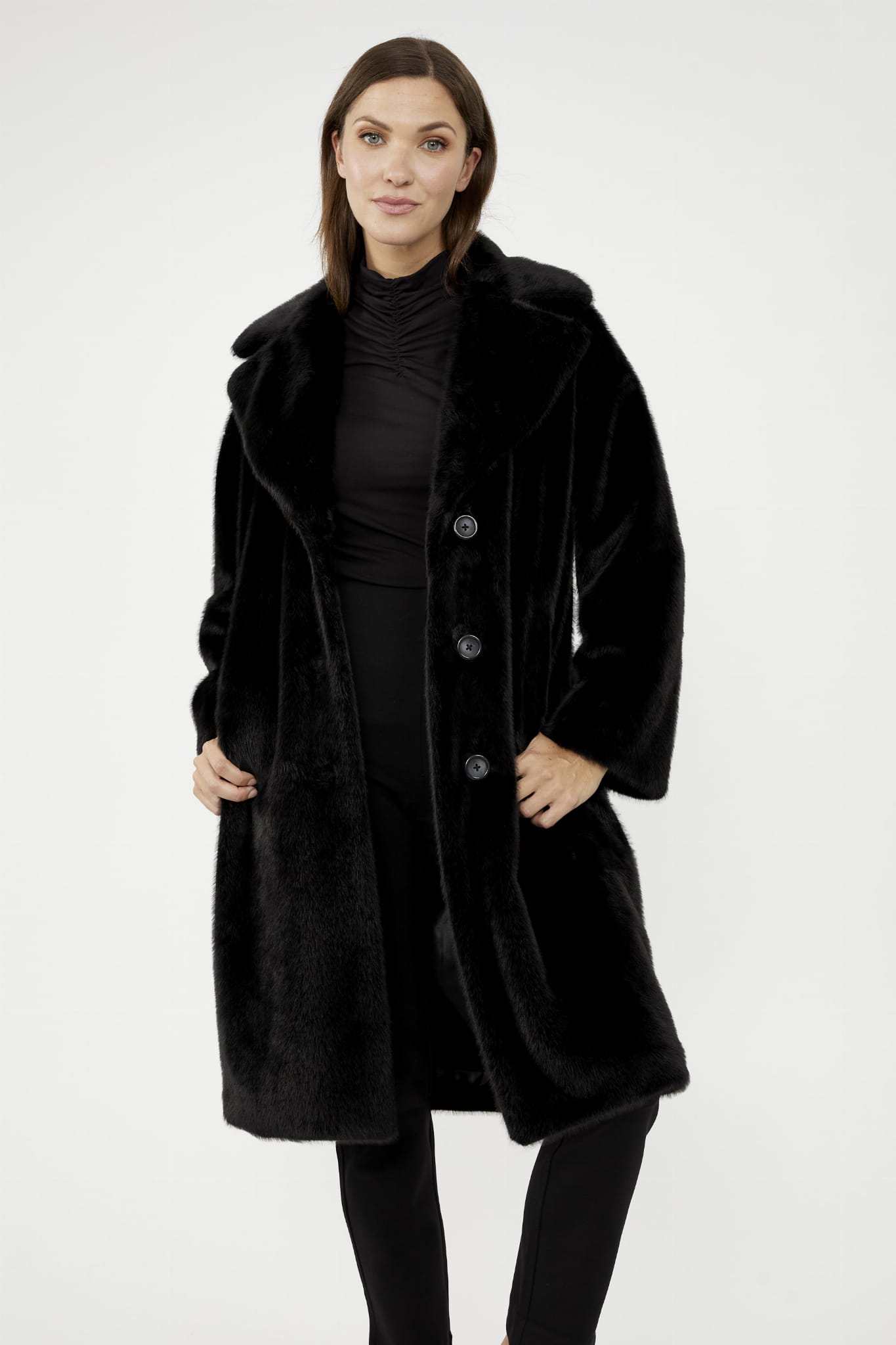 Joseph Ribkoff 243902 Sztuczne futerko z wykładanym kołnierzem dostępne w trzech kolorach - butelkowa zieleń, czarny i bordo. Futerko o klasycznym prostym kroju z kieszeniami, zapinane na guziki. Ciepłe, bardzo wygodne i niezwykle eleganckie. Idealne na jesień i zimę.