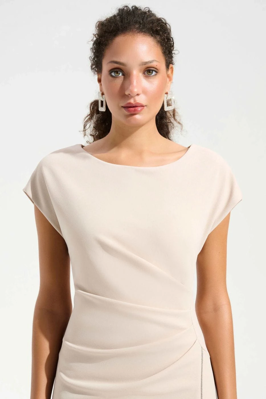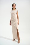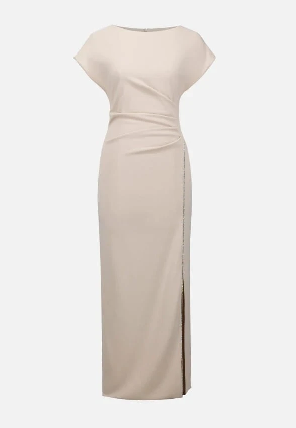 Joseph Ribkoff 261713-3677 długa, elegancka suknia w kolorze beżowym, która pięknie podkreśla kobiecą sylwetkę. Subtelne marszczenia w talii modelują figurę, a ozdobne rozcięcie z połyskującym dżetami dodają jej lekkości i szyku. Klasyczny dekolt i krótkie rękawki tworzą ponadczasową, wyrafinowaną formę. Elastyczna tkanina nie krępuje ruchów, sprawi, że poczujesz się stylowo, bardzo elegancko i jednocześnie komfortowo. Idealna na wesela, przyjęcia i wieczorne wyjścia. Komfort i luksus w stylu Joseph Ribkoff.