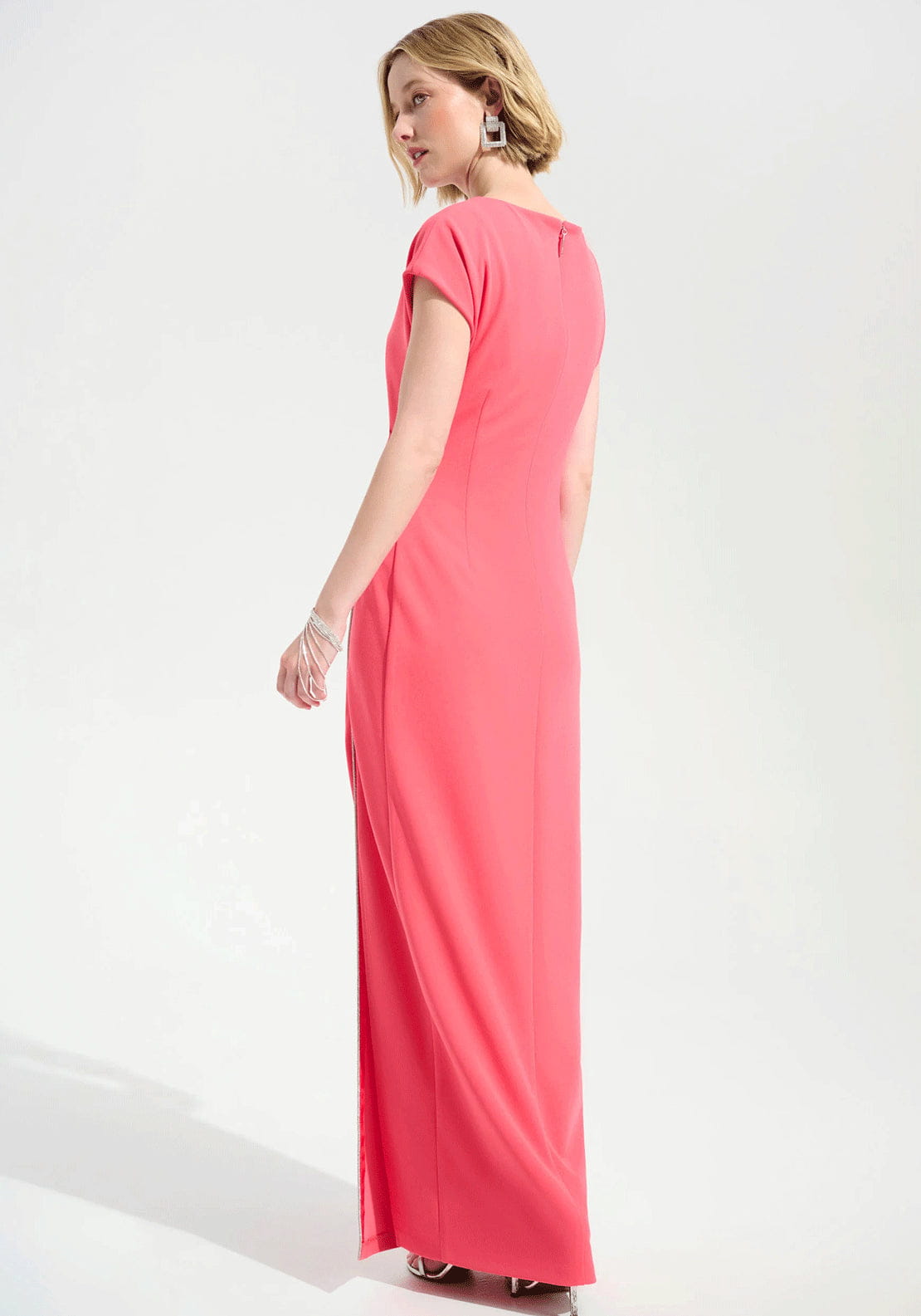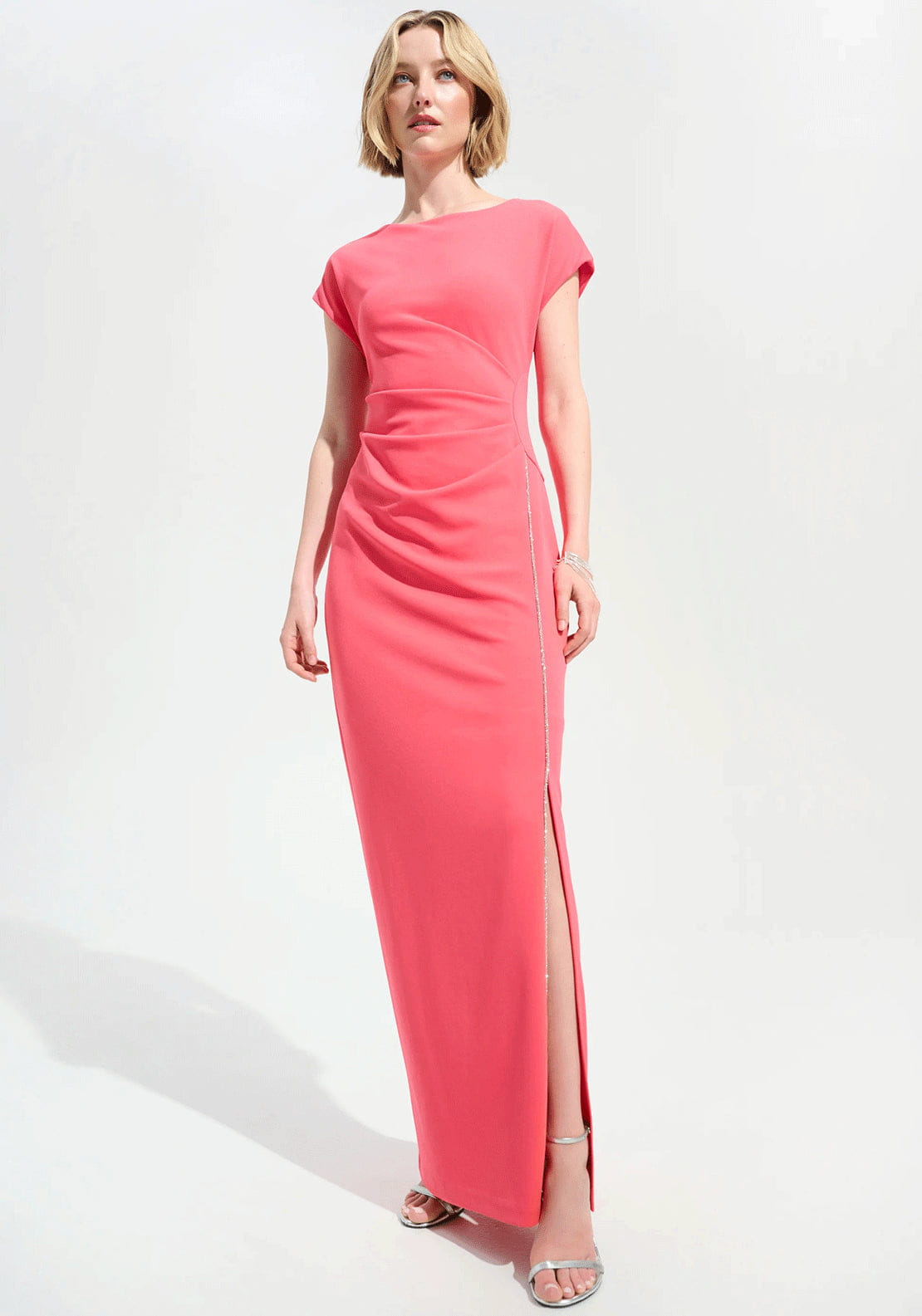 Joseph Ribkoff 261713-4479 długa, elegancka suknia w intensywnym malinowo-koralowym odcieniu, która pięknie podkreśla kobiecą sylwetkę. Subtelne marszczenia w talii modelują figurę, a ozdobne rozcięcie z połyskującym dżetami dodają jej lekkości i szyku. Klasyczny dekolt i krótkie rękawki tworzą ponadczasową, wyrafinowaną formę. Elastyczna tkanina nie krępuje ruchów, sprawi, że poczujesz się stylowo, bardzo elegancko i jednocześnie komfortowo. Idealna na wesela, przyjęcia i wieczorne wyjścia. Komfort i luksus w stylu Joseph Ribkoff.