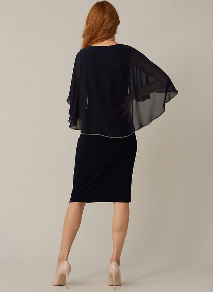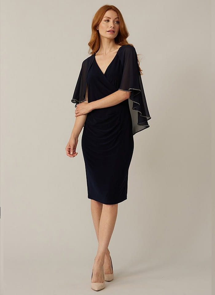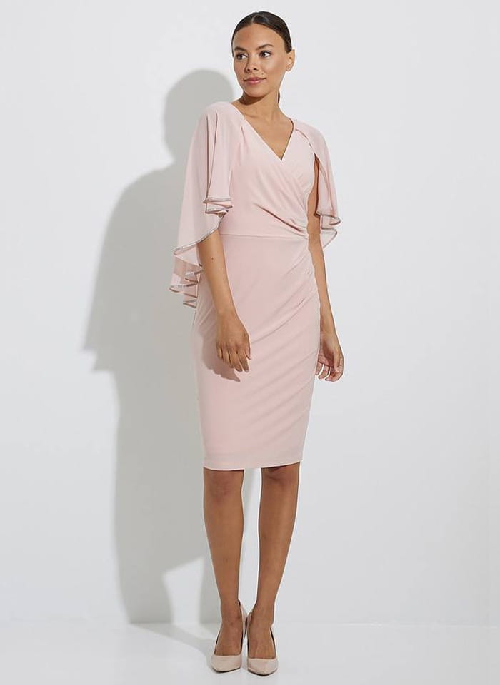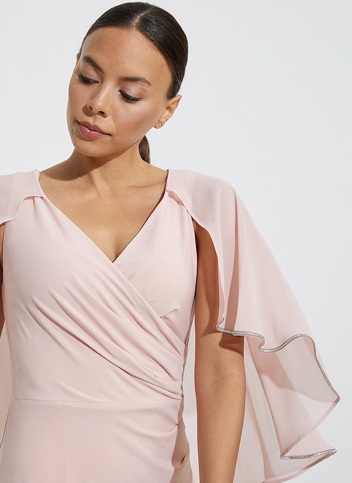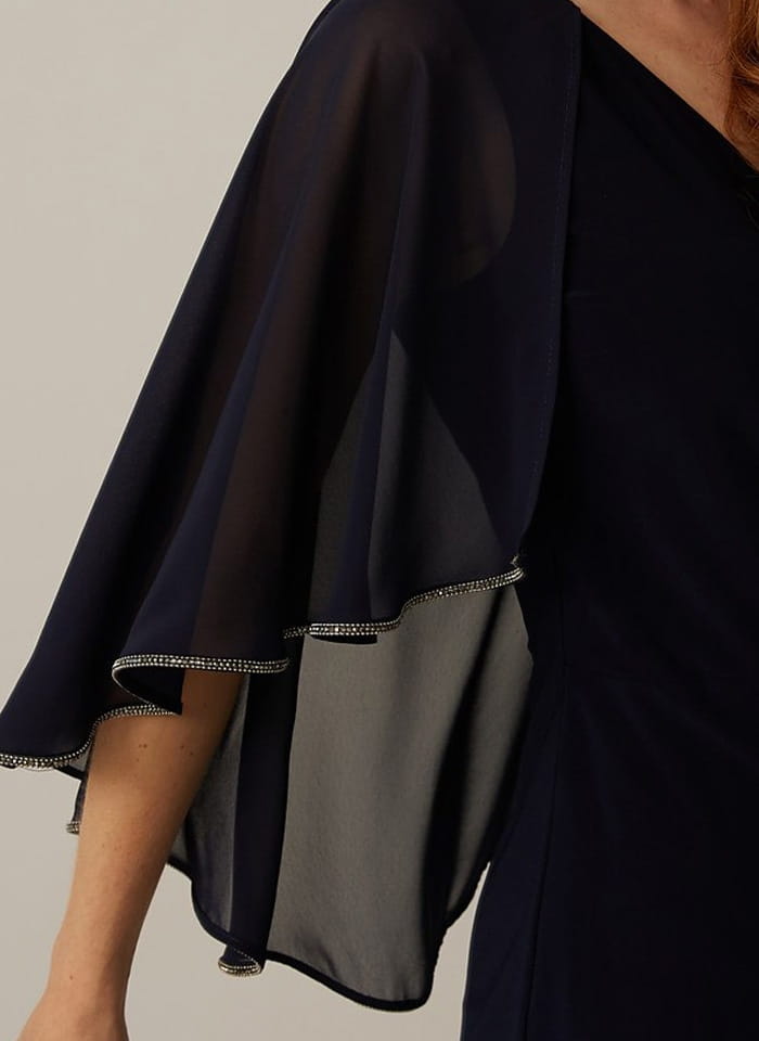 Joseph Ribkoff, Wizytowa sukienka z pelerynką zakończona ozdobna taśmą zdobioną cyrkoniami dostępna w 4 kolorach grancie, jasnym różu, szafirowym i fioletowym